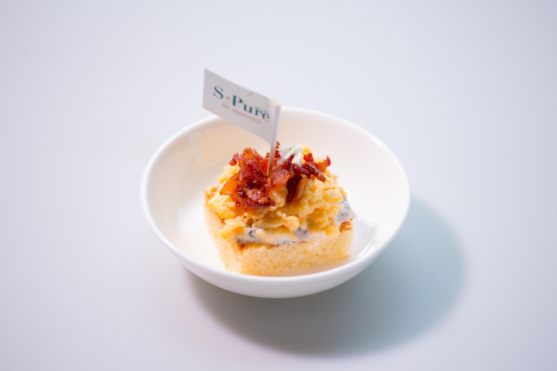 เสริมโปรตีนด้วยเมนู “ไข่กวนและเบคอนซอสทรัฟเฟิลมาโย” เลือกใช้ไข่ไก่จาก S-Pure ที่นำมากวนและเสริฟ์บนขนมปังมินิบันที่นำไปจี่กับกะทะให้กรอบนอกเล็กน้อย ทาด้วยซอสเห็ดทรัฟเฟิลมาโย โรยตกแต่งเพื่อเพิ่มความกรุบกรอบด้วย S-Pure Prime เบคอนหมูรมควัน