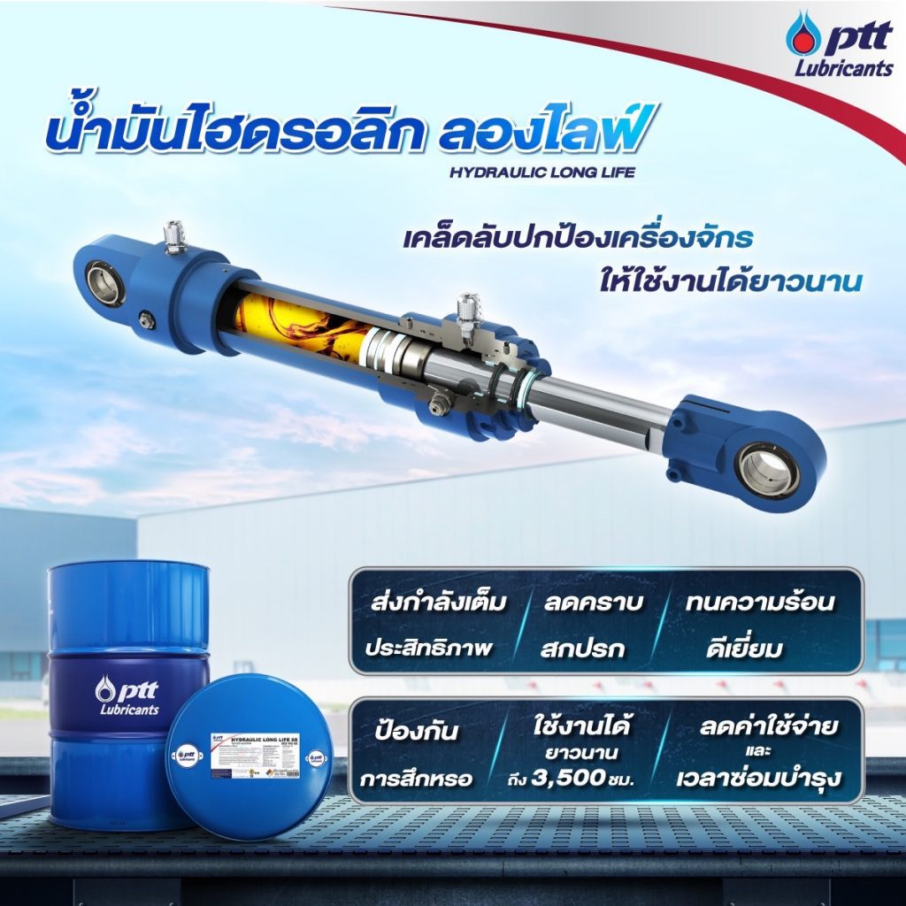 พีทีที ลูบริแคนท์ส ขอแนะนำน้ำมันไฮดรอลิก “ไฮดรอลิก ลองไลฟ์” น้ำมันไฮดรอลิกคุณภาพสูงสำหรับเครื่องจักร ด้วยคุณสมบัติที่ช่วยต้านทานการสึกหรอ พร้อมทนความร้อนได้ดีเยี่ยม ลดการเกิดคราบสกปรกเหมาะสำหรับอุปกรณ์ไฮดรอลิกรุ่นใหม่ที่ใช้งานต่อเนื่องยาวนาน อีกทั้งเปลี่ยนถ่ายแค่ครั้งเดียวใช้งานได้ยาวนานกว่า ช่วยยืดอายุการใช้งานได้สูงสุดถึง 3,500 ชั่วโมง ทำให้ลดระยะเวลาและประหยัดค่าใช้จ่ายในการซ่อมบำรุงเครื่องจักรได้มากกว่า