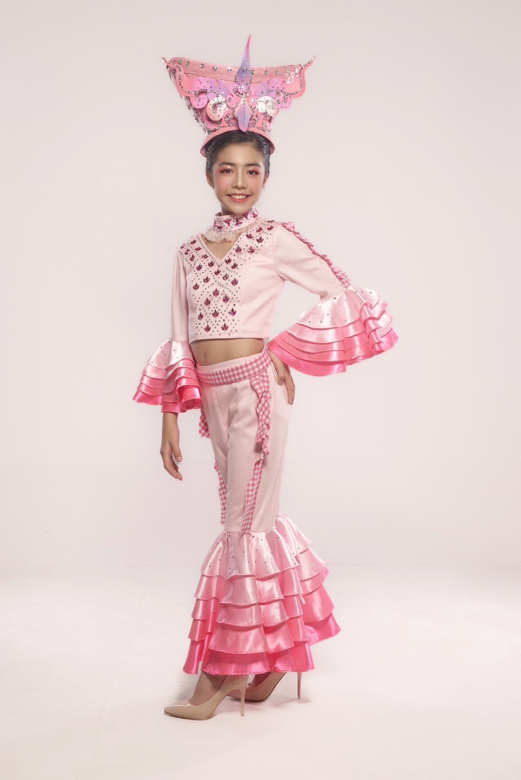 สำหรับตัวชุด น้องไข่มุกและคุณแม่ช่วยกันออกแบบใหม่ ซึ่งได้รับแรงบันดาลใจมาจากเทศกาลผีตาโขนตัดเย็บจากผ้าไหมสีชมพูหลากหลายเฉด ผสมผสานกับผ้าขาวม้าที่ทอจากเส้นใยฝ้ายที่มีลวดลายตารางเป็นเอกลักษณ์ เครื่องประดับศีรษะดัดแปลงจากหวดที่นึ่งข้าวเหนียวที่ทำจากตอกสานด้วยไม้ไผ่ แล้วนำมาตกแต่งลวดลายไทยแบบใหม่ให้เกิดความสวยงามแปลกตา จนคว้ารางวัล Outstanding Designer มาครอง