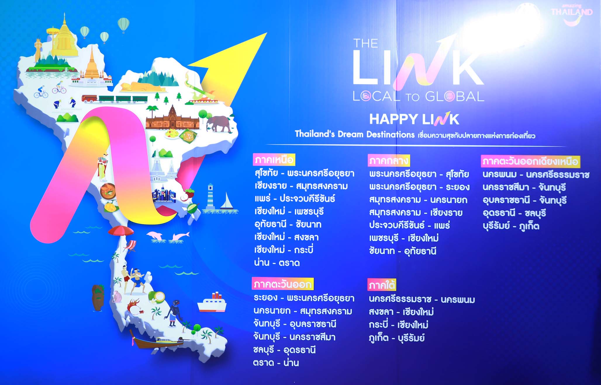 29 สิงหาคม 2566 : การท่องเที่ยวแห่งประเทศไทย (ททท.) เชิญชวนนักท่องเที่ยวร่วมเปิดประสบการณ์การเดินทางครั้งใหม่ กับโครงการ “เส้นทางท่องเที่ยวเชื่อมโยง Happy Link : Thailand’sDream Destinations เชื่อมความสุขกับปลายทางแห่งการท่องเที่ยว ภายใต้ โครงการ The LINK Localto Global” ที่ ททท. จัดขึ้นเพื่อส่งเสริมและกระตุ้นให้เกิดการเดินทางท่องเที่ยวข้ามภูมิภาค ด้วยการนำเสนอภาพลักษณ์การท่องเที่ยวในแหล่งท่องเที่ยวที่มีศักยภาพ ผ่านสินค้าและบริการด้านการท่องเที่ยวที่พัฒนาและยกระดับในมุมมองใหม่