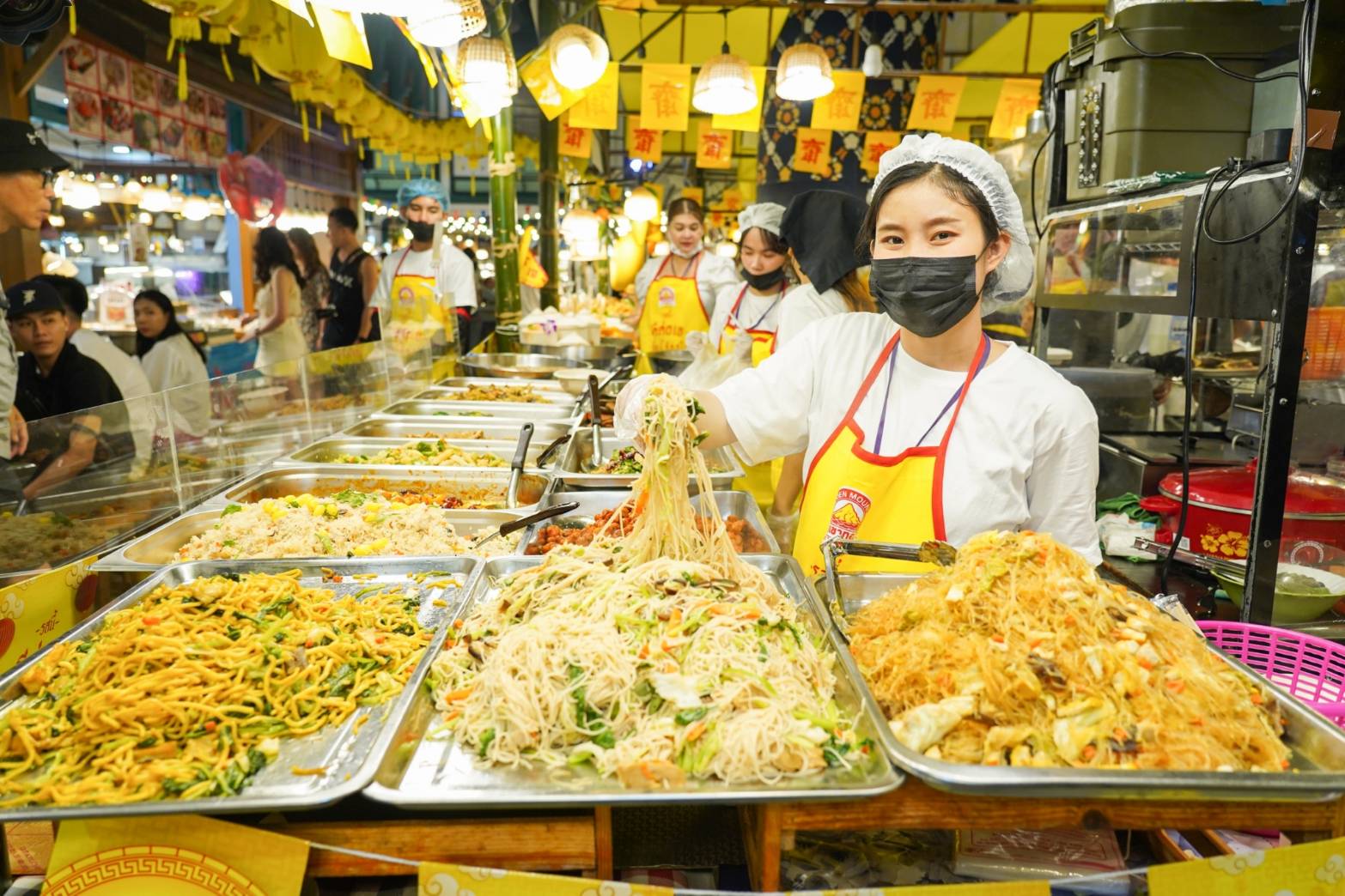 พร้อมกันนี้ภายในงานได้พบกับความพิเศษมากมาย อาทิ เมนูพิเศษ “เมี่ยงก๋วยเตี๋ยว 3 กษัตริย์” รังสรรค์โดย เชฟป้อม หม่อมหลวงขวัญทิพย์ เทวกุล ผู้เชี่ยวชาญทางด้านอาหาร 1 ในกรรมการรายการอาหาร Master Chef ประเทศไทย Brand Ambassador Chef ซอสภูเขาทอง โดยใช้วัตถุดิบได้แก่ ไส้ที่ 1 หน่อไม้และเห็ดหอม ไส้ที่ 2 เผือก , สมหวัง(แห้ว) และฟองเต้าหู้ ไส้ที่ 3 เห็ดรวม, เต้าหู้ และหัวไชโป้ว ผสมผสานกับซอสปรุงรสภูเขาทอง จากบริษัท ไทยเทพรส จำกัด (มหาชน) ได้อย่างกลมกล่อมและลงตัวในแบบอาหารเจ ซึ่งเป็นเมนูที่จำหน่ายครั้งแรกและที่นี่ที่เดียวในเมืองสุขสยาม