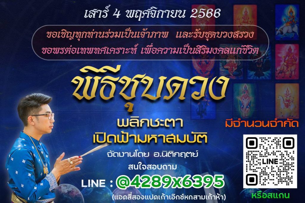 นับเป็นมหาฤกษ์มงคลเหมาะแก่การทำพิธีสะเดาะเคราะห์เสริมดวงปลุกเสกตนเอง อ.นิติกฤตย์ จึงได้จัดงานมหามงคล “พิธีชุบดวงพลิกชะตาเปิดฟ้ามหาสมบัติ” บูชาเทพทศเคราะห์ทั้ง 10 ดาว 10 ทิศ ที่คุ้มครองดวงชะตามนุษย์ นับเป็นครั้งแรกในการสวดสะเดาะเคราะห์ที่มีการสวดบูชาดาวทั้ง 10 ซึ่งพิธีทั่วไปจะมี 9 ดาวเท่านั้น แต่พิธีชุบดวงนี้ได้ผนวกบูชาดาวมฤตยูด้วย เพื่อให้อดโทษลดโทษ โดยพิธีจะจัดขึ้นในวันที่ 4 พฤศจิกายน ณ ลานโชว์ดีซี พระราม 9 ซึ่งอาจารย์นิติกฤตย์ก็ได้เผยถึงการจัดงานครั้งนี้ว่า…..