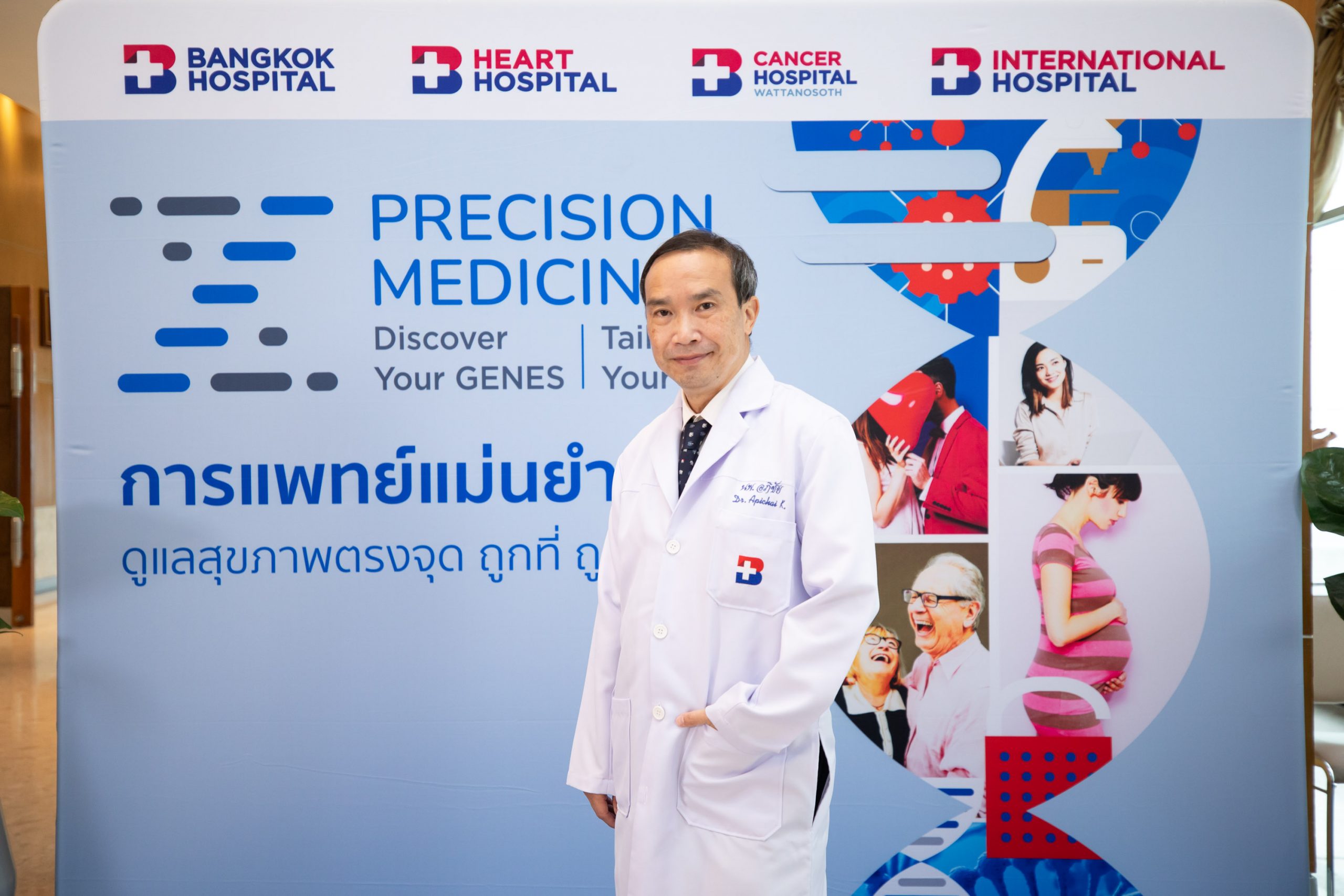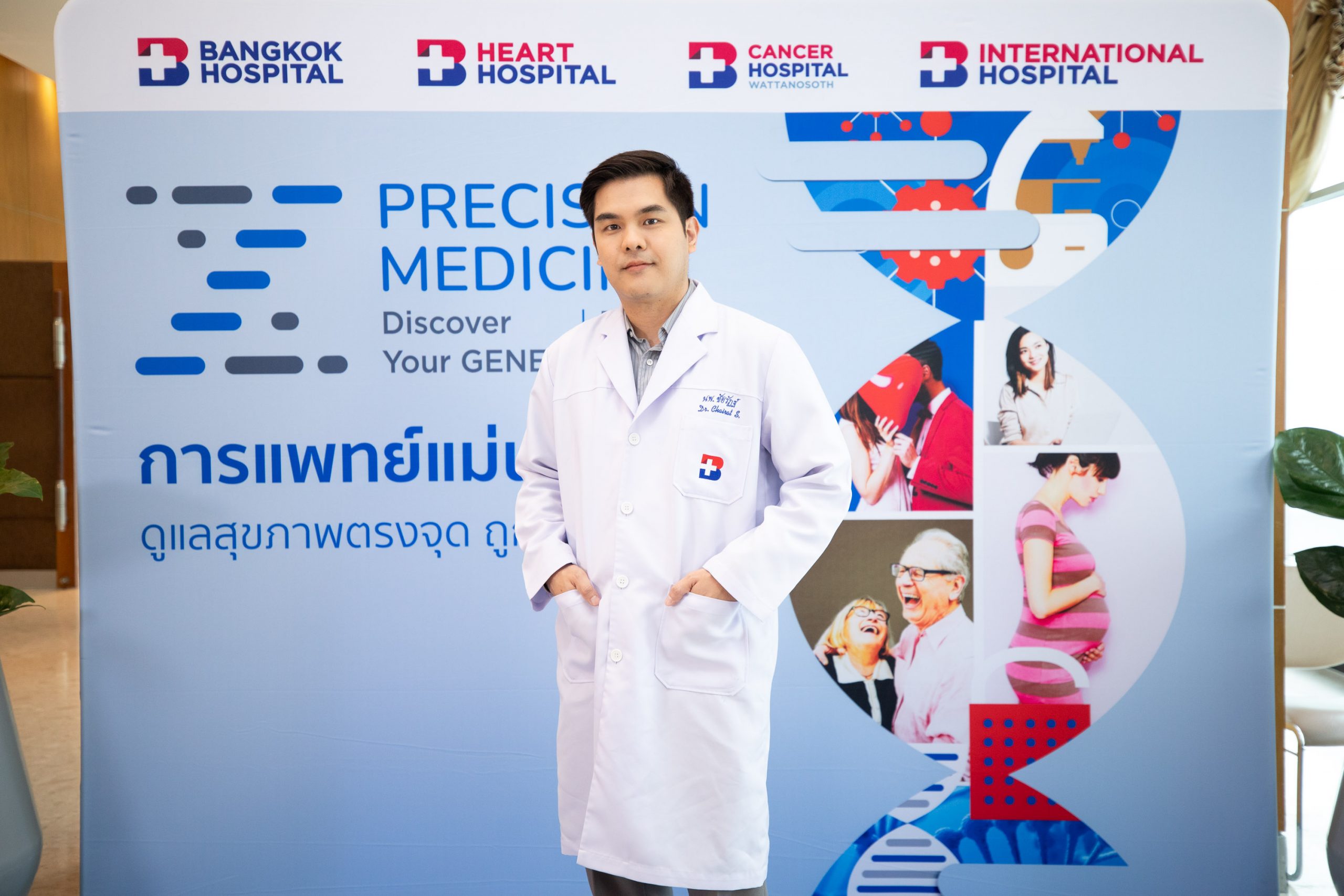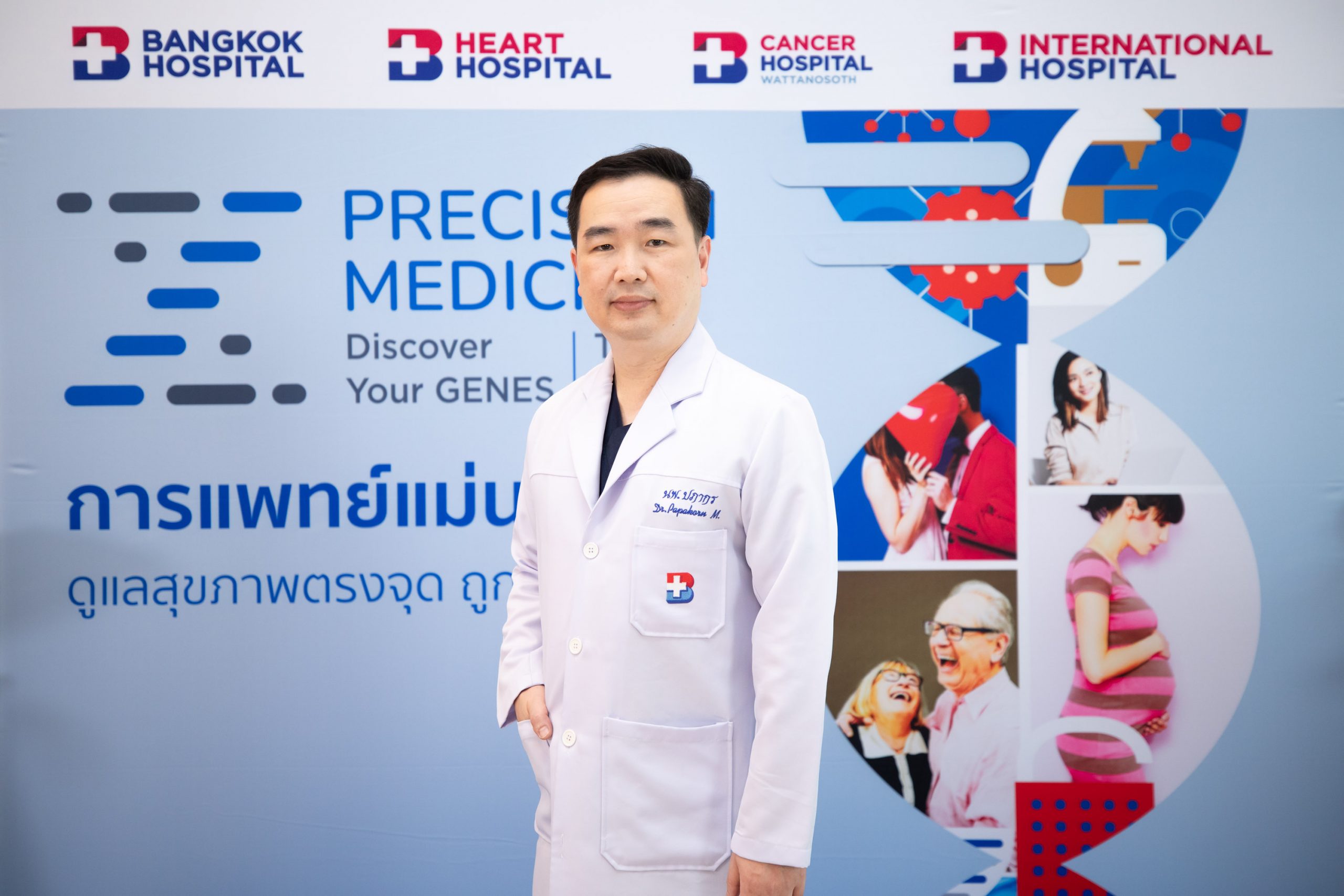“ยีน” คือ รหัสพันธุกรรมในตัวเราที่ควบคุมลักษณะของแต่ละคนให้แตกต่างกัน ไม่ว่าจะเป็นลักษณะภายนอก เช่น สีตา สีผิว ความสูง ไปจนถึงความเสี่ยงในการเกิดโรคหลายชนิด ซึ่งยีนมีผลกับสุขภาพในทุกช่วงชีวิต ตั้งแต่ก่อนตั้งครรภ์ ขณะตั้งครรภ์ วัยเด็ก วัยผู้ใหญ่ วัยผู้สูงอายุ รวมถึงการวางแผนสุขภาพและการดูแลผู้ป่วยในบางโรค ถ้าเราสามารถวางแผนการดูแลสุขภาพอย่างเหมาะสมและแม่นยำด้วยยีนในตัวเรา ย่อมช่วยประเมินความเสี่ยงการเกิดโรคต่าง ๆ ในอนาคต ป้องกันก่อนเกิดโรคได้ ในโอกาสนี้โรงพยาบาลกรุงเทพได้จัดงานแถลงข่าว “Precision Medicine: การแพทย์แม่นยำ กับบทบาทของยีนเพื่อสุขภาพในทุกช่วงเวลาของชีวิต” ณ ห้องประชุม ชั้น 7 อาคารเวชศาสตร์ฟื้นฟู โรงพยาบาลกรุงเทพ