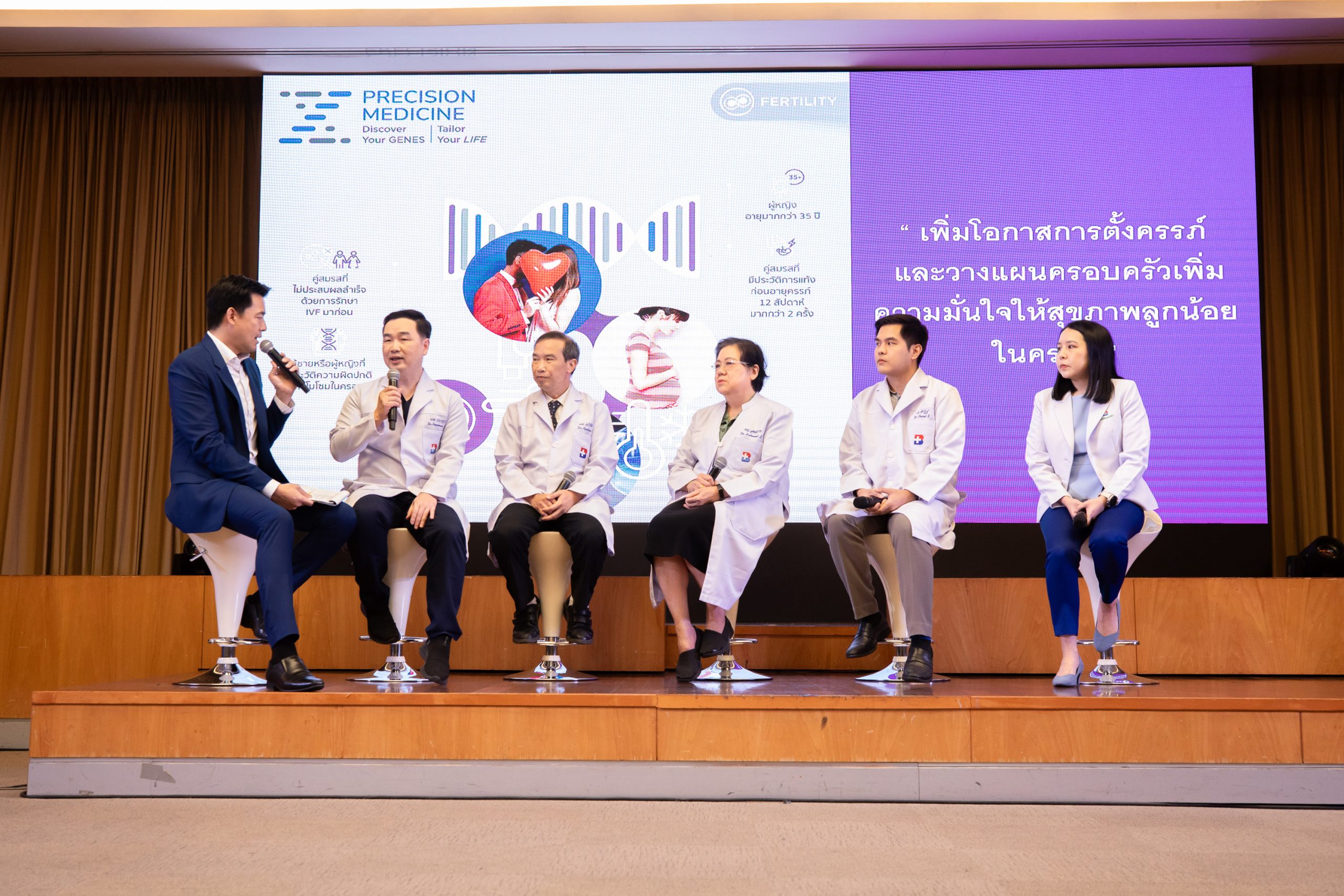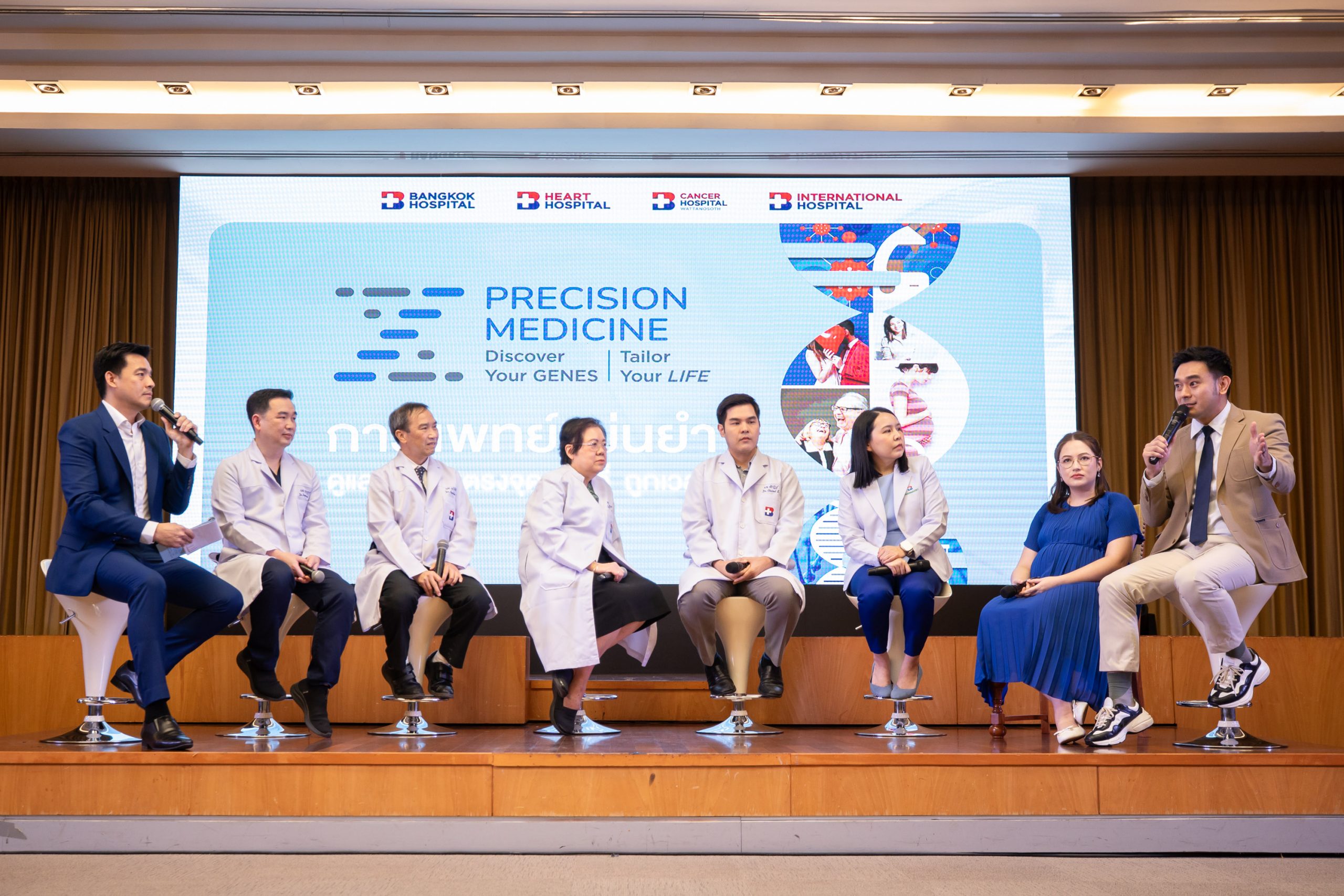 นอกจากนี้ยังมีแพทย์ผู้ชำนาญการในแต่ละสาขา มาร่วมพูดคุยเรื่อง “Precision Medicine กับความสำคัญของสุขภาพ” ในหัวข้อต่าง ๆ ดังนี้ “เพิ่มโอกาสการตั้งครรภ์ และวางแผนครอบครัวเพิ่มความมั่นใจให้สุขภาพลูกน้อยในครรภ์” โดย นพ.ปภากร มิ่งมิตรพัฒนะกุล, “การป้องกันและตรวจพันธุกรรมความเสี่ยงโรคหัวใจ” โดย นพ.อภิชัย คงพัฒนะโยธิน, “บทบาทของ Precision Medicine : การแพทย์แม่นยำ กับการวางแผนการรักษามะเร็ง” โดย ศ.คลินิก พญ.สุดสวาท เลาหวินิจ, “ตรวจประเมินไลฟ์สไตล์การใช้ชีวิต เพื่อลดความเสี่ยงในการเกิดโรค” โดย นพ.ชัยรัฏฐ์ ศรีภิรมย์ และ “PHARMACOGENOMICS เลือกยาให้ตรงยีน เพิ่มประสิทธิภาพ มั่นใจความปลอดภัย” โดย ภญ.ภัทริยา จันทรทรัพย์ เภสัชกร และแขกรับเชิญพิเศษ คุณเต๊ะ ศตวรรษ เศรษฐกร และ แจ็คกี้-แพรวไพลิน ภรรยา มาร่วมเผยการดูแลสุขภาพในช่วงตั้งครรภ์