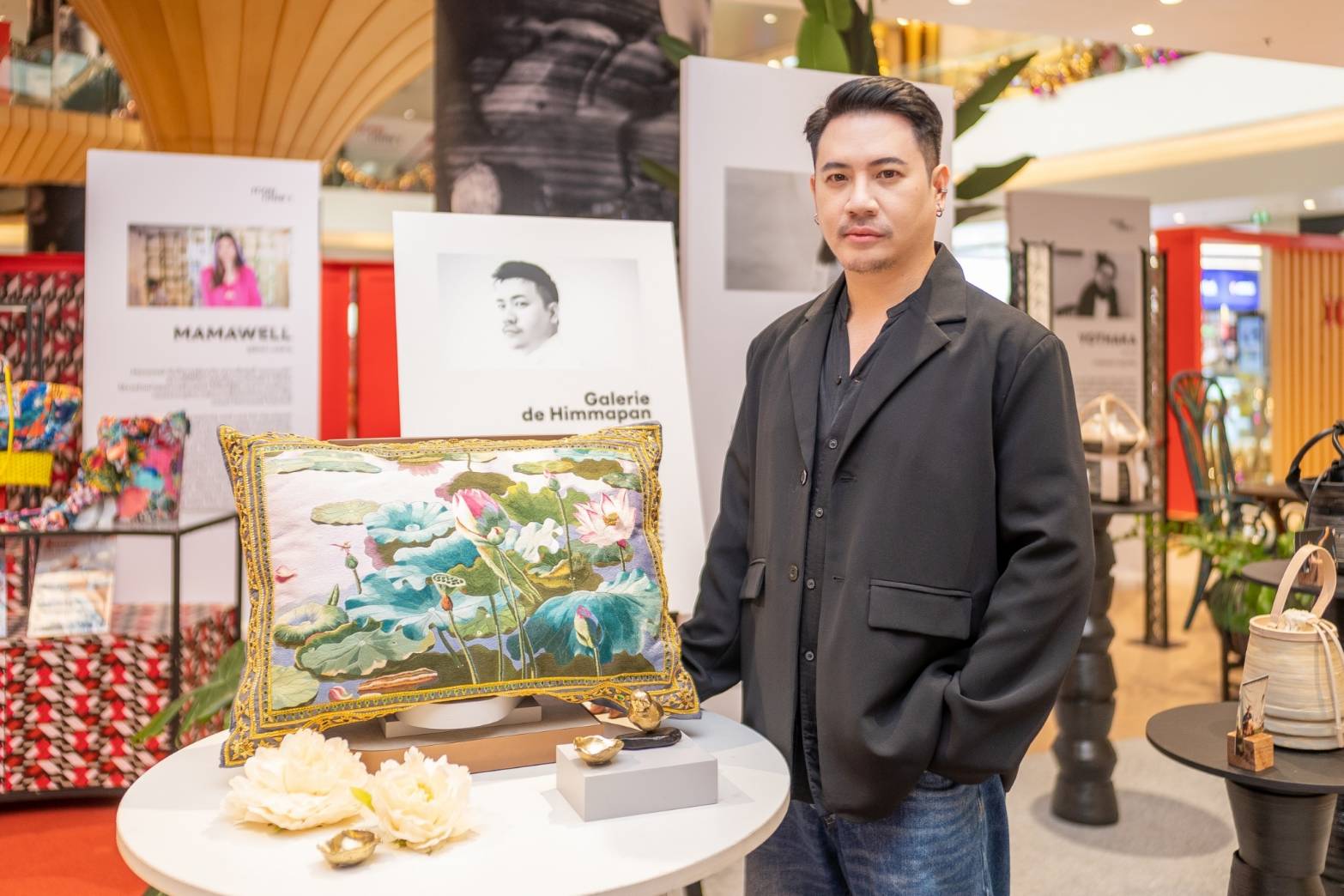 แบรนด์ที่มุ่งถ่ายทอดความงามของงานช่างศิลป์ไทย อย่าง “Galerie De Himmapan” นำเสนอหมอนอิง “บึงบัว” (Lotus Pond) ที่รังสรรค์ขึ้นอย่างวิจิตร โดยนำผ้าปักรูปบึงบัวฝีมือแม่บ้านชาวมุสลิมในพื้นที่ภาคใต้ของมูลนิธิส่งเสริมศิลปาชีพ มาทำเป็นหน้าหมอน ผสมผสานกับผ้าไหมผืนงาม แล้วปักเพิ่มเติมด้วยเทคนิคการเดินดิ้นทองคำแบบราชสำนักไทย ประดับปีกแมลงทับลงไปบนขอบ เป็นหมอนอิงที่งดงามและมีเพียงใบเดียวในโลก ซึ่งนับเป็นความพิเศษที่ทำขึ้นเพื่อเฉลิมฉลองให้กับไอคอนคราฟต์และไอคอนสยามโดยเฉพาะ
