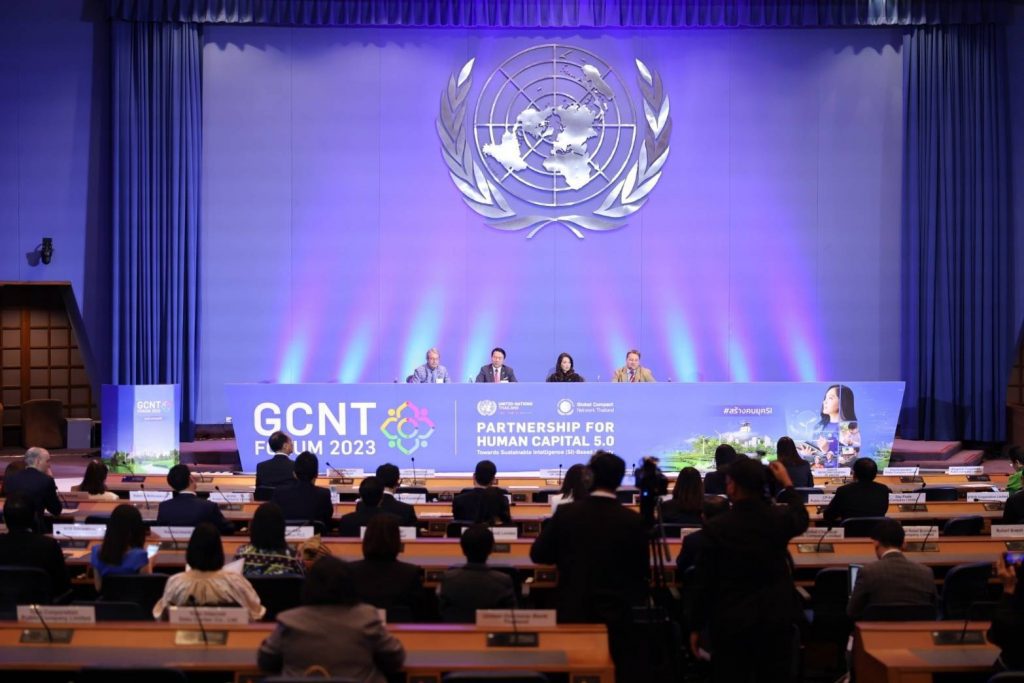 การประชุมผู้นำภาคเอกชนประจำปี ‘GCNT Forum 2023” ในครั้งนี้ เป็นการรวมสมาชิก UNGCNT และพันธมิตรเข้าร่วมงานกว่า 60 องค์กร 7 สถาบันการศึกษา 15 องค์กรเยาวชน อาทิ สำนักงานคณะกรรมการกำกับหลักทรัพย์และตลาดหลักทรัพย์, ผู้แทนที่ประชุมอธิการบดีแห่งประเทศไทย, สถาบันบัณฑิตบริหารธุรกิจศศินทร์แห่งจุฬาลงกรณ์มหาวิทยาลัย, วิทยาการจัดการ มหาวิทยาลัยมหิดล เป็นต้น พร้อมผู้นำองค์กรธุรกิจชั้นนำ ร่วมกันแบ่งปันประสบการณ์การเตรียมความพร้อมของ “คน” หรือทรัพยากรมนุษย์ เพื่อให้บรรลุเป้าหมายการพัฒนาที่ยั่งยืนอย่างแท้จริง ตลอดจนประกาศเจตนารมณ์ที่จะส่งเสริมการพัฒนาทรัพยากรบุคคล อย่างน้อย 1 ล้านคน ใน 133 องค์กรสมาชิกสมาคมฯ ภายในปี ค.ศ. 2030 เตรียมตั้ง Sustainable Intelligence Youth Club เพิ่มศักยภาพคนรุ่นใหม่ ในปี ค.ศ. 2024 ผ่านการเรียนรู้โดยตรงจากภาคธุรกิจและพันธมิตรสู่สังคมแห่งภูมิปัญญาที่ยั่งยืน