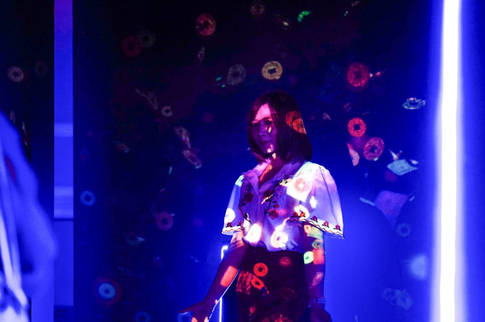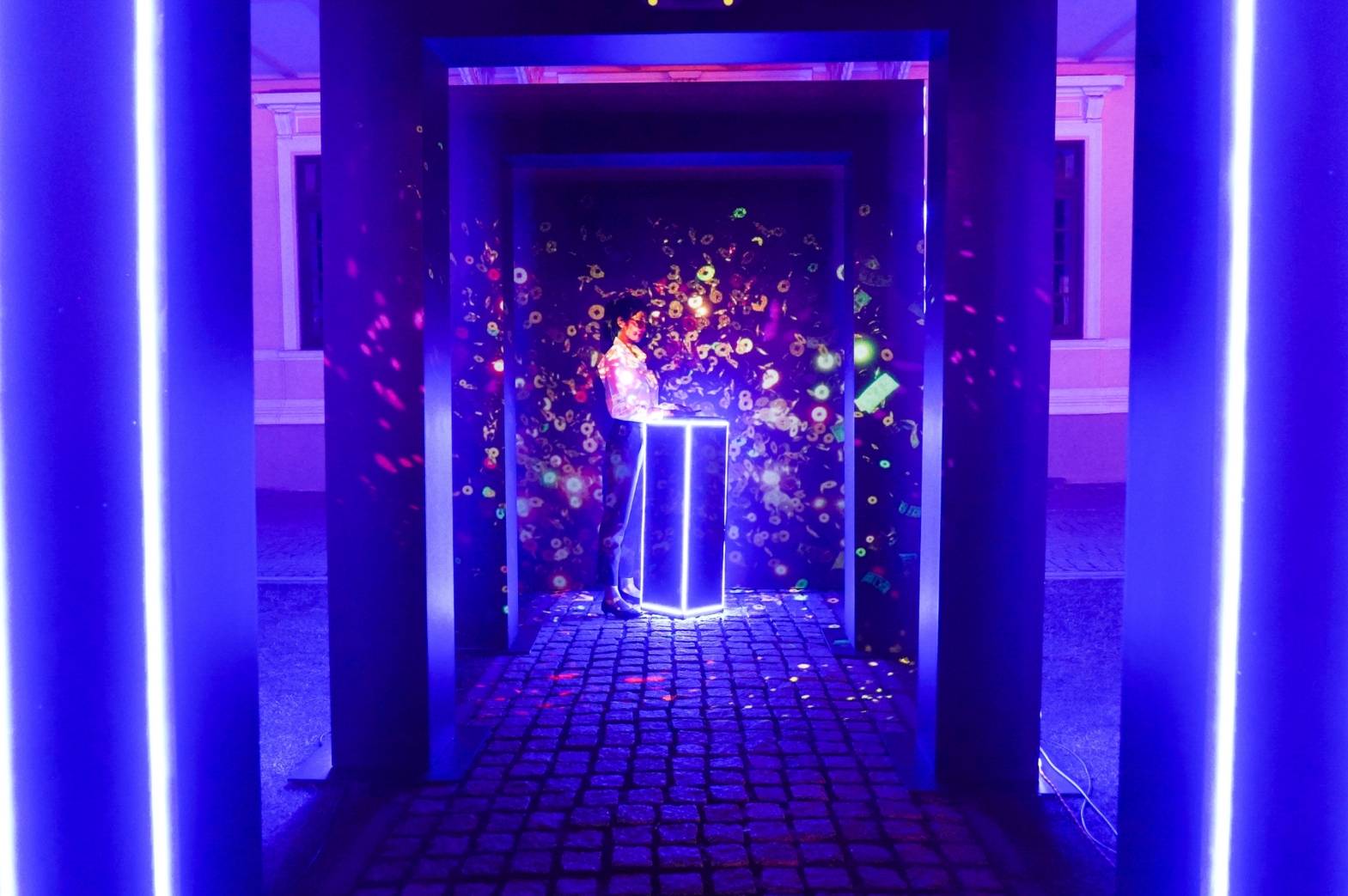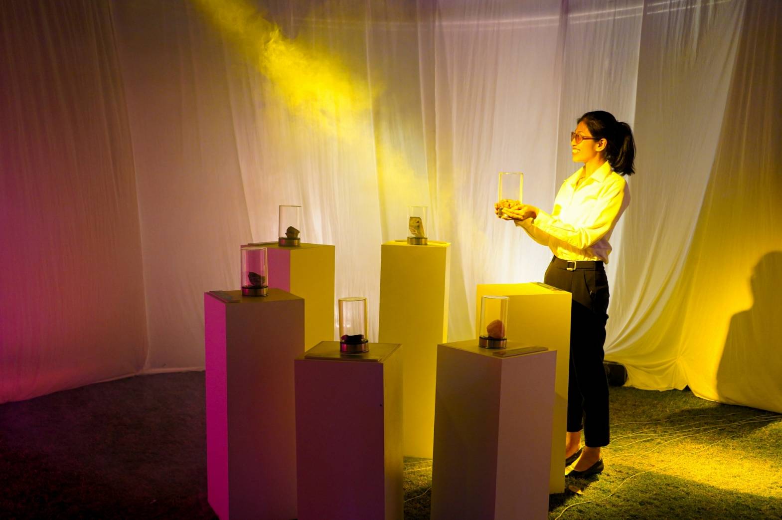 ชิ้นที่ 2 “อาบแสงจากพลังงานหินนำโชค Immersive Bathed in the Power of Auspicious Stones” บอกเล่าความเชื่อเรื่องของหินแต่ละชนิด ที่มีพลังงานเสริมมงคลในด้านต่างๆ มาสร้างสรรค์เป็นงาน Lighting Design ไม่ว่าจะเป็น หินแห่งความรักโรสควอตซ์ (Rose Quartz), หินแห่งการเริ่มต้นใหม่มาลาไคต์ (Malachite), หินแห่งความฉลาดฟลูออไรต์ (Fluorite), หินแห่งความมุ่งมั่นคาร์เนเลี่ยน (Carnelian), หินแห่งความโชคดีไทเกอร์อาย (Tiger’s eye), หินปลดหนี้ไคยาไนท์ (Kyanite) โดยใช้สีที่เกิดจากความเชื่อเรื่องพลังงานในหินมงคล ส่องลง Installation จนกลายเป็นแสง Immersive อาบตัว แสงนั้นจะส่องสว่างยิ่งกว่าฉีดวิตามินหนึ่งแสน ซีซี นำทางเราไปเรื่อยๆ แม้ว่าตัวเราจะเคลื่อนไหวไปที่ไหนก็ตาม