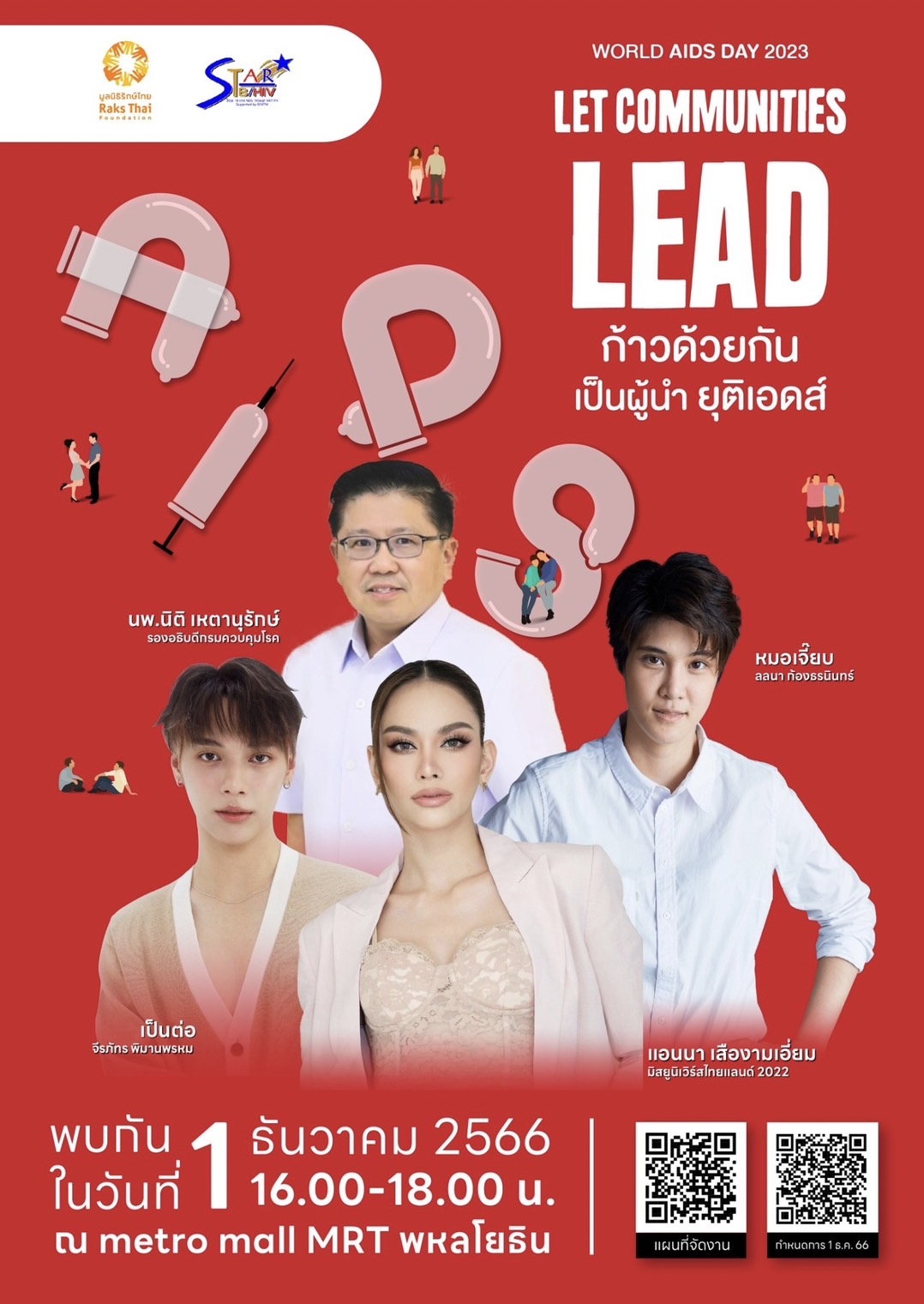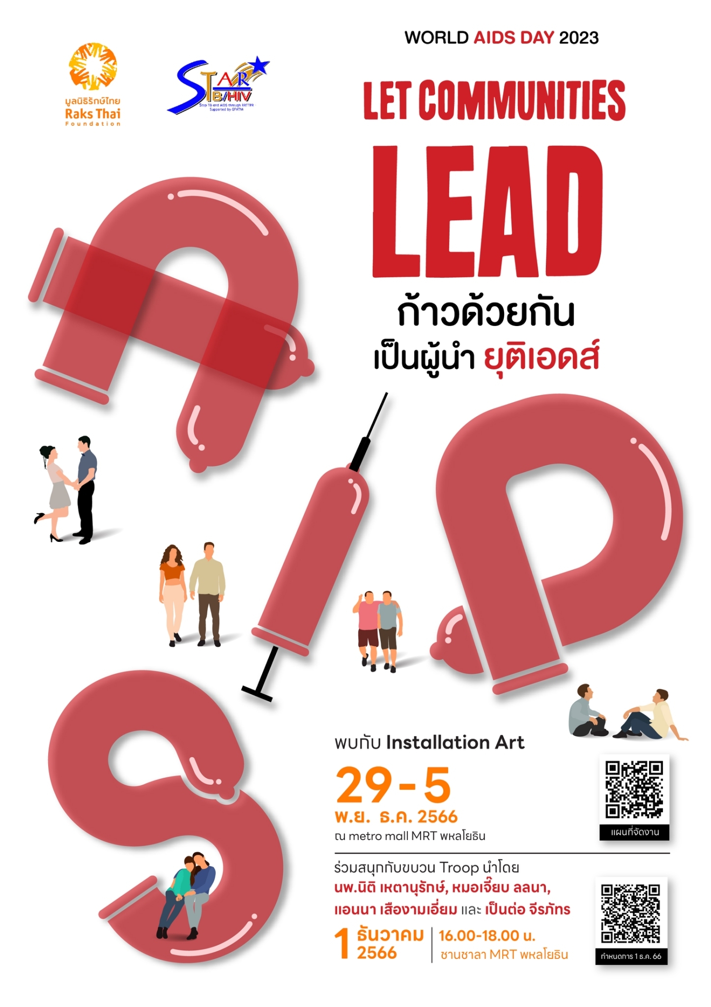 จึงขอเชิญชวนให้ทุกท่าน ก้าวด้วยกัน เป็นผู้นำ ยุติเอดส์ กับกิจกรรม Installation Art รูปถุงยาง, Sex education รูปแบบใหม่ ‘Lucky Draw Lucky โดน’, คลิปมุมมองต่อการยุติเอดส์จากผู้นำชุมชน และกระบอกเสียงคนสำคัญในสังคม โดยกิจกรรมเหล่านี้ สามารถร่วมสนุกและรับชมได้ตั้งแต่วันที่ 29 พ.ย. 2566 – 5 ธ.ค. 2566 ตั้งแต่เวลา 9.00 น. – 20.00 น. โดยพิธีเปิดงานอย่างเป็นทางการ จะจัดขึ้นวันที่ 1 ธ.ค. 2566 16.00 – 18.00 โดยได้รับเกียรติจาก นายแพทย์นิติ เหตานุรักษ์ รองอธิบดีกรมควบคุมโรค เป็นประธานเปิดงาน และพบกับขบวนทรูปรณรงค์ พร้อมกับผู้นำในการก้าวเดินครั้งนี้คือ คุณหมอเจี๊ยบ ลลนา, คุณแอนนา เสืองามเอี่ยม มิสยูนิเวิร์สไทยแลนด์ 2022 และ คุณเป็นต่อ จีรภัทร ดารานักแสดง ร่วมงานแถลงข่าว พร้อมแลกเปลี่ยนมุมมองต่อการยุติเอดส์ผ่านกิจกรรม ก้าวด้วยกัน เป็นผู้นำ ยุติเอดส์ และภายในงานยังมีกิจกรรมให้ร่วมถ่ายภาพที่มุม AIDS และติด Hashtag #Letcommunitieslead #Worldaidsday2023 และพบกันได้ที่บริเวณ Metro mall สถานีรถไฟฟ้าใต้ดิน พหลโยธิน ทางออก 5