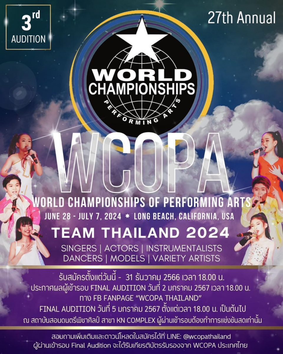 และโอกาสในการสร้างชื่อเสียงให้ประเทศไทย การคัดเลือกตัวแทนประเทศไทย กับโครงการ World Championshiops of Performing Arts 2024 เฟ้นหาตัวแทนประเทศไทย เข้าร่วมการแข่งขันความสามารถทางศิลปะการแสดง เครื่องดนตรี การเต้น การร้องเพลง และการเดินแบบในระดับนานาชาติจากผู้เข้าแข่งขันมากกว่า 70 ประเทศทั่วโลก ณ Los Angels ประเทศสหรัฐอเมริกา ก็กลับมาอีกครั้ง