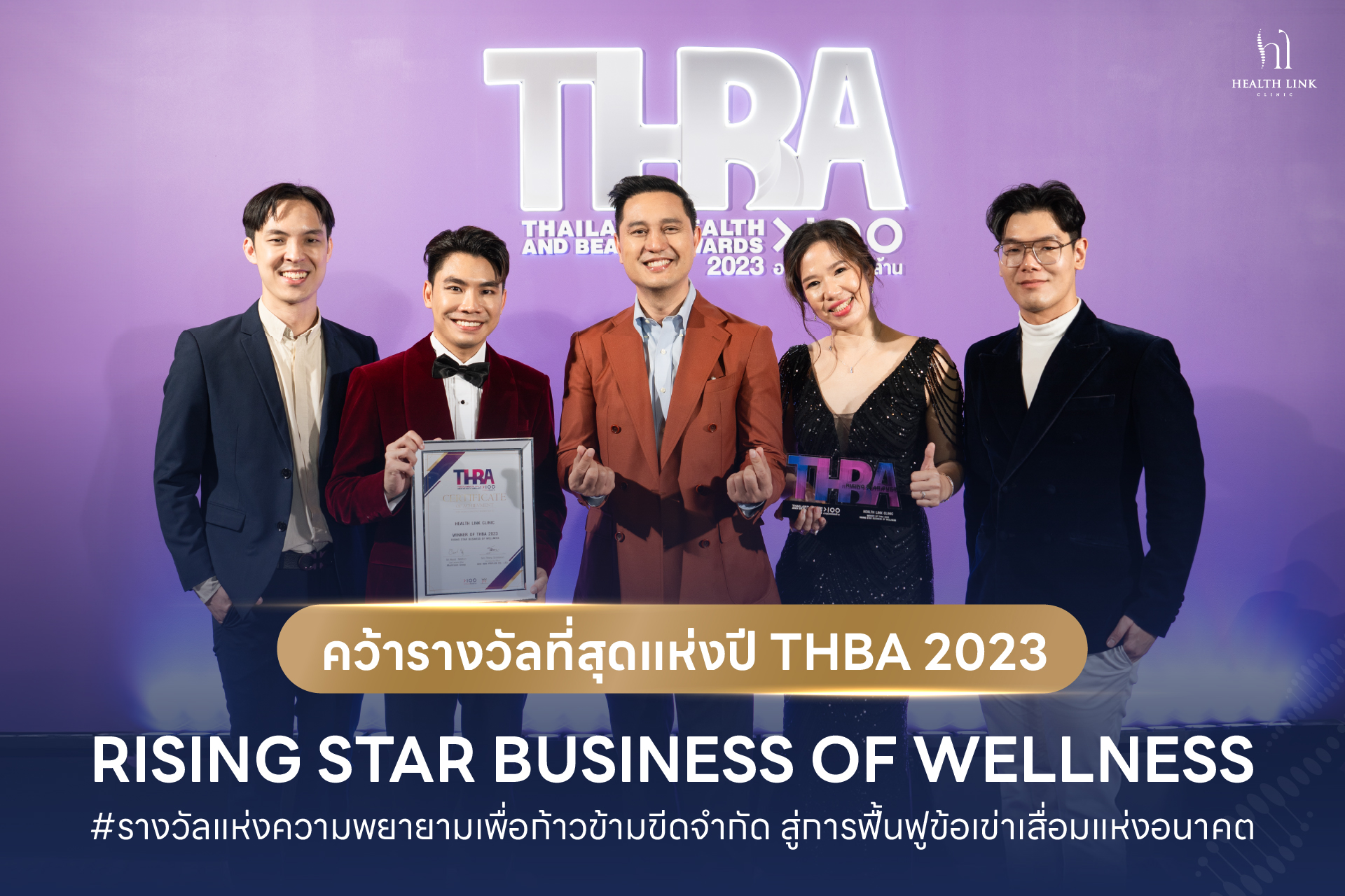 Chief Executive Officer “คุณวริสา ทองเงิน” และ Chief Marketing Officer “คุณศรายุท จันทร์ศรี” จาก Health Link Clinic คลินิกรักษาข้อเข่าเสื่อม โดยไม่ต้องผ่าตัด เดินทางเข้ารับรางวัลในงานประกาศรางวัลสุดยิ่งใหญ่แห่งปี “THBA 2023 : THAILAND HEALTH AND BEAUTY AWARDS 2023” ในสาขา “Rising Star Business Of Wellness” ซึ่งรางวัลนี้เป็นการตอกย้ำมาตรฐาน และการันตีคุณภาพ สำหรับผู้ประกอบการธุรกิจด้านสุขภาพ ความงามของประเทศไทย เพื่อช่วยยกระดับไปสู่มาตรฐานสากล