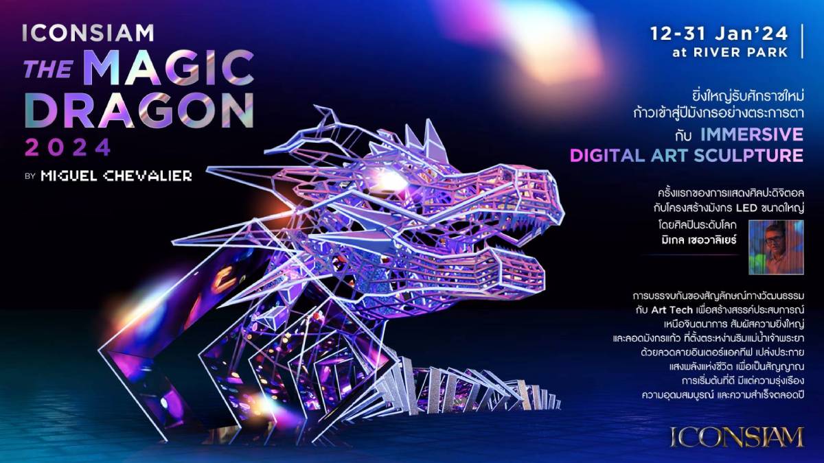 ไอคอนสยาม แลนด์มาร์กระดับโลกริมแม่น้ำเจ้าพระยา จัดงาน The Magic Dragon 2024 by Miguel Chevalier เฉลิมฉลองในโอกาสครบรอบ 5 ปี ไอคอนสยาม ต้อนรับปีมังกร พ.ศ. 2567 ครั้งแรกของการแสดงศิลปะดิจิตอลบนประติมากรรมรูปมังกร LED ขนาดใหญ่ โดย Miguel Chevalier ศิลปินระดับโลกชาวฝรั่งเศส ผู้บุกเบิกการสร้างสรรค์ศิลปะดิจิทัลที่ผสมผสานความคิดและเทคโนโลยีล้ำสมัย พร้อมที่จะเปิดให้ทุกคนมาร่วมสัมผัสความยิ่งใหญ่ ตั้งแต่วันที่ 12 – 31 มกราคม 2567 ณ ริเวอร์ พาร์ค ชั้น G ไอคอนสยาม