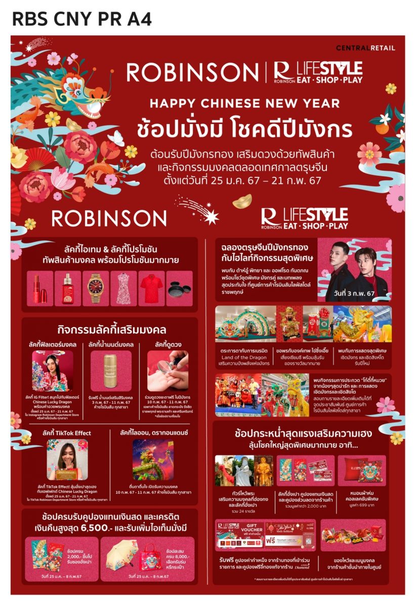 มาร่วม ‘ช้อปมั่งมี โชคดีปีมังกร’ กับแคมเปญตรุษจีนแห่งปี “ROBINSON & ROBINSON LIFESTYLE HAPPY CHINESE NEW YEAR 2024” ตั้งแต่วันที่ 25 ม.ค. 67 – 21 ก.พ. 67 ที่ห้างโรบินสัน ทุกสาขา (ยกเว้นสาขาจังซีลอน) และศูนย์การค้าโรบินสันไลฟ์สไตล์ทั้วประเทศ รวมทั้งหลากหลายช่องทางการช้อปปิ้งสุดสะดวกของห้างฯ ไม่ว่าจะเป็น Robinson Chat & Shop, Robinson Personal Shopper On Demand โทร.1425 Central App และเว็บไซต์ www.central.co.th ตลอด 24 ชั่วโมง รวมทั้ง Facebook Fanpage: Robinson Department Store และ Robinson Lifestyle