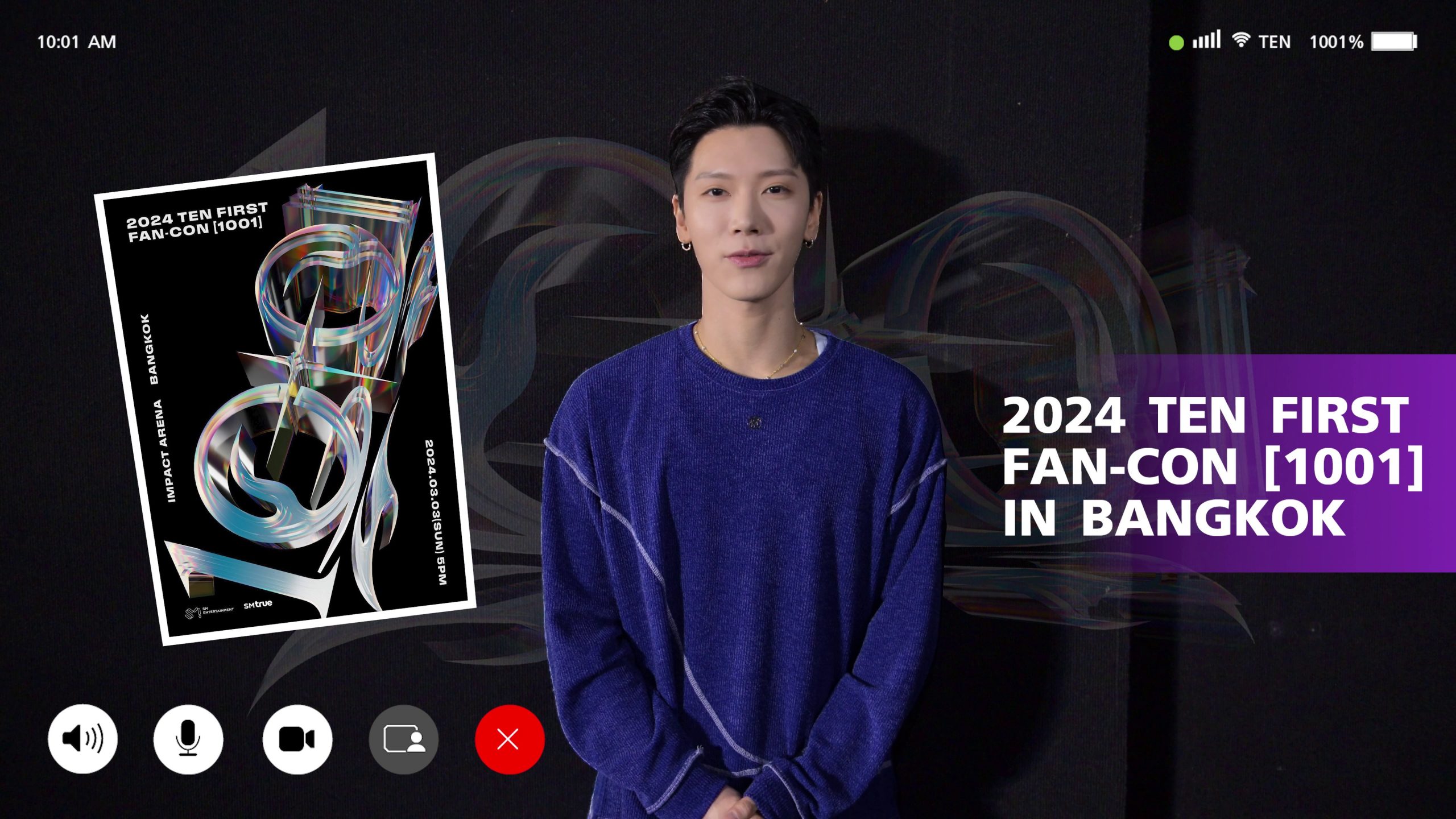 ❝สวัสดีครับแฟน ๆ ชาวไทยทุกกคน ‘TEN’ (เตนล์) มีข่าวดีมาบอกทุกคนว่า ‘TEN’ (เตนล์) จะจัดงานแฟนคอนขึ้นในประเทศไทยที่อิมแพ็ค อารีน่านะครับ โดย 2024 TEN FIRST FAN-CON [1001] IN BANGKOK จะจัดขึ้นในวันอาทิตย์ที่ 3 มีนาคม 2567 และนี่เป็นครั้งแรกที่ ‘TEN’ (เตนล์) จะได้ไปแสดงที่อิมแพ็ค อารีน่า ก็รู้สึกตื่นเต้นมาก ๆ เลย และหวังว่าแฟน ๆ ทุกคนจะมาร่วมสนุกกับ ‘TEN’ (เตนล์) นะครับ และเราก็มาสร้างความทรงจำดี ๆ กันครับ แล้วเดี๋ยวเราเจอกันครับ บ๊ายบาย ❞
