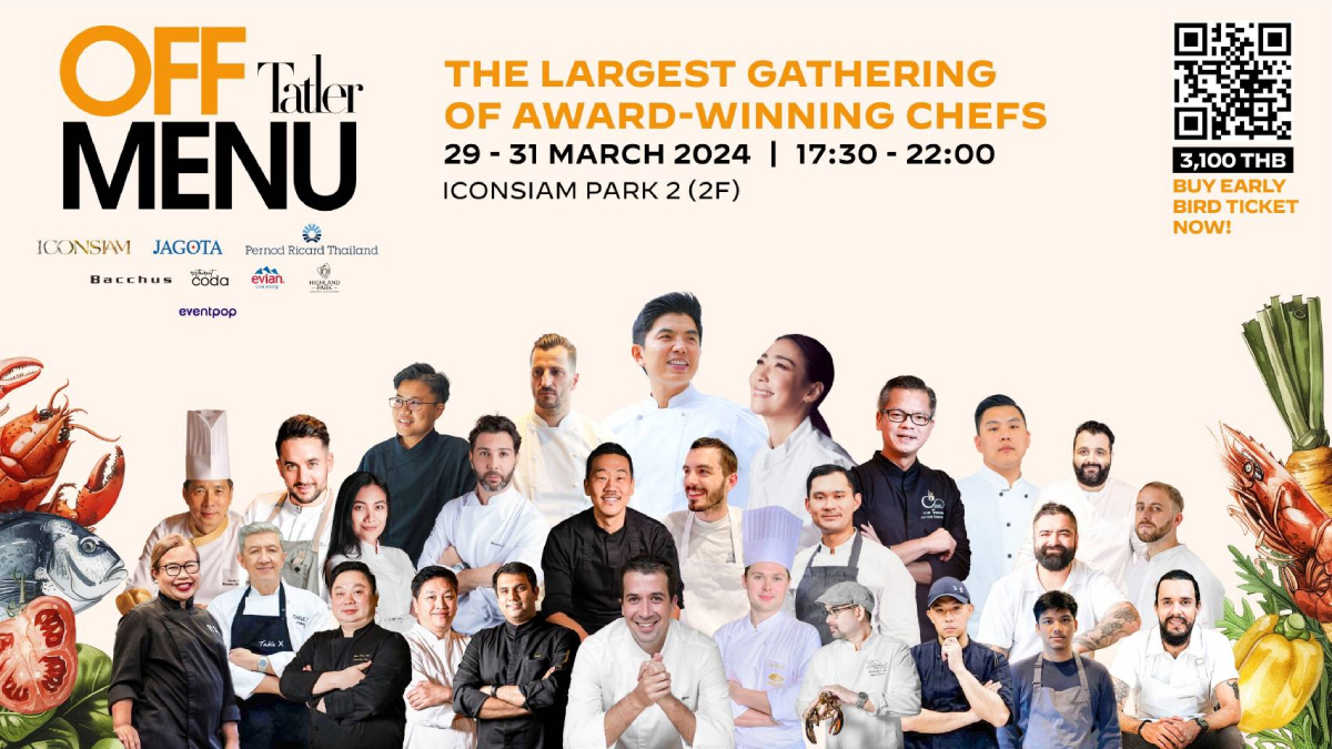ภายในงาน Tatler Off Menu ผู้เข้าร่วมงานจะได้ลิ้มลองอาหารจานพิเศษ จำนวน 20 เมนู ที่ปรุงโดยเชฟมากฝีมือที่มีชื่อเสียงโด่งดังระดับชาติ (ประเทศ) ระดับเอเชีย และระดับโลก รวมถึงยังได้เพลิดเพลินไปกับค็อกเทลสุดสร้างสรรค์จากมิกโซโลจิสต์ชั้นนำของประเทศไทย ที่ได้รับแรงบันดาลใจมาจากวัตถุดิบพื้นถิ่นไทย มารังสรรค์เป็นเอ็กซ์คลูซีฟเมนูเครื่องดื่ม จำนวน 2 แก้ว ให้คุณได้จิบเคล้าเสียงเพลงจากดีเจ Honey Gee ซึ่งเป็นคนไทยคนเดียวที่ติด World’s Top 90 Female DJ ของโลก ท่ามกลางทัศนียภาพอันงดงามของไอคอนสยาม แลนด์มาร์กระดับโลกริมแม่น้ำ