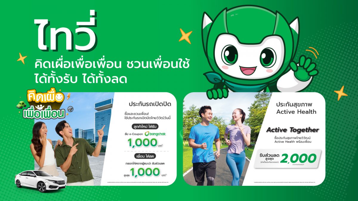 โดยมาสคอตไทวี่จะถูกนำไปใช้ในแพลตฟอร์มต่าง ๆ ของบริษัทฯ และยังมาพร้อมกับโปรโมชันพิเศษ ภายใต้คอนเซ็ปต์ “ประกันภัยที่คนใช้ และบอกต่อ” ด้วยแคมเปญ “คิดเผื่อเพื่อเพื่อน ชวนเพื่อนใช้ ได้ทั้งรับ ได้ทั้งลด” สำหรับลูกค้าใหม่ที่ซื้อ “ประกันรถเปิดปิด” ครั้งแรก รับ e-Coupon เติมน้ำมันบางจาก มูลค่า 1,000 บาท เมื่อแนะนำเพื่อนมาซื้อประกันรถเปิดปิดที่เข้าร่วมรายการ และเพื่อนยังได้รับส่วนลดสูงสุดถึง 1,000 บาท เมื่อใช้รหัสโปรโมชันที่เพื่อนแนะนำ นอกจากนี้สำหรับประกันภัยสุขภาพ Thaivivat Active Health เมื่อซื้อพร้อมเพื่อน ยังได้รับส่วนลด สูงสุดท่านละ 2,000 บาท โดยสามารถสอบถามรายละเอียดหรือติดตามข่าวสารและโปรโมชันอัปเดตของไทยวิวัฒน์ได้ที่ www.thaivivat.co.th หรือโทร.02-200-7000 ตั้งแต่วันนี้ ถึง 30 มิถุนายน 2567