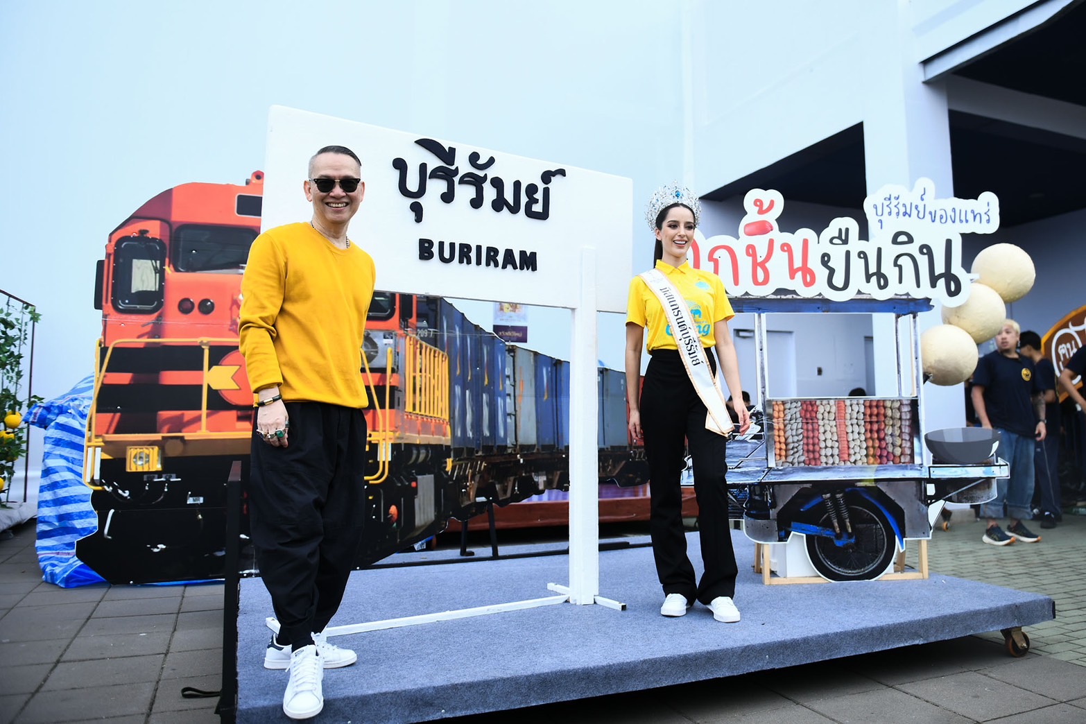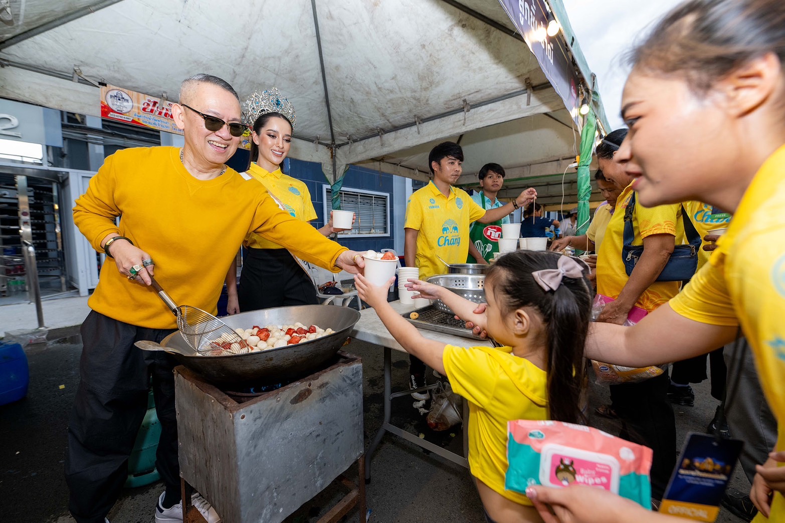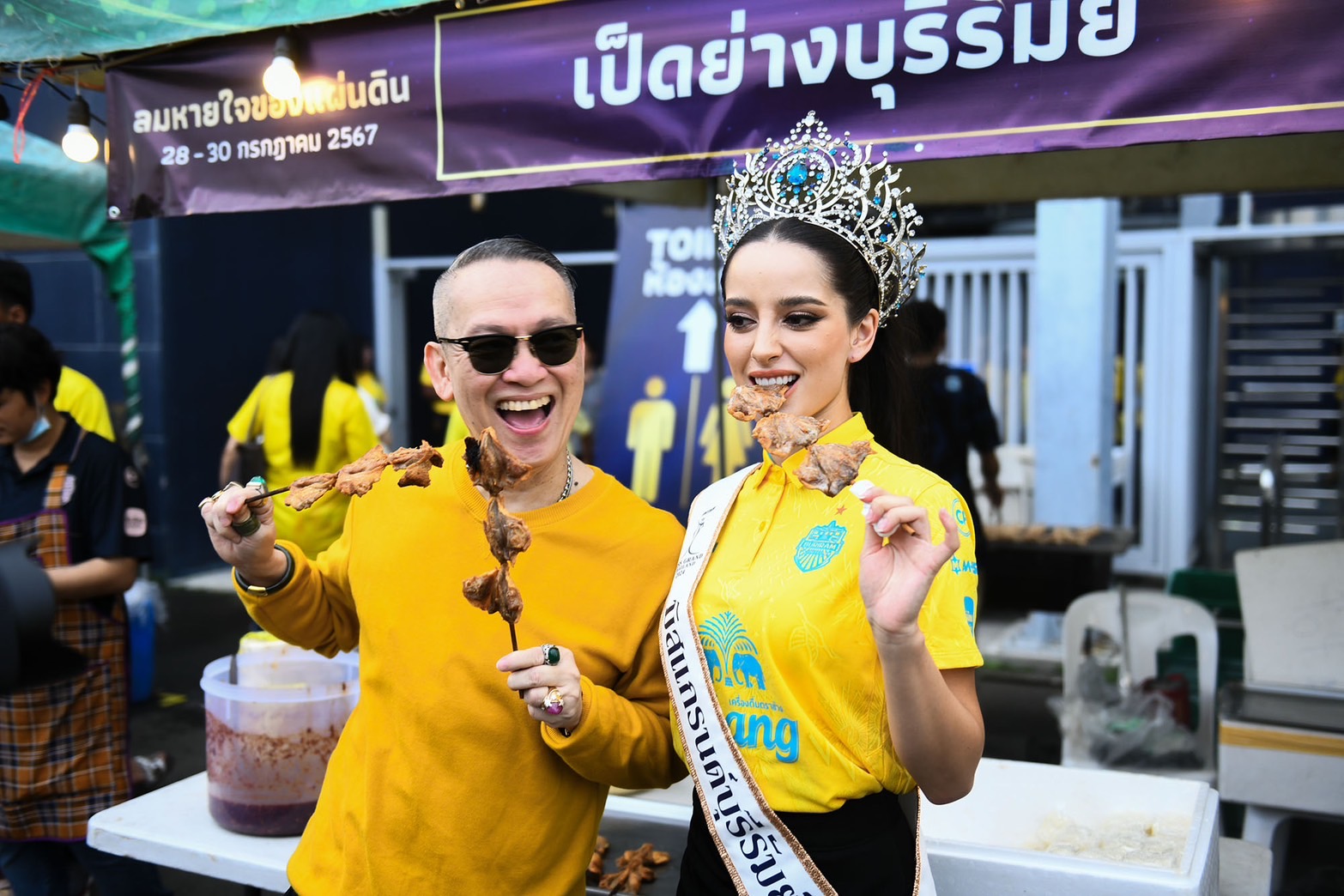 จากนั้น เอมี กับ ป้าตือ-สมบัษร ถิระสาโรช ก็พร้อมใจกันทำกิจกรรมจิตอาสา ด้วยการช่วยกันทอดลูกชิ้นยืนกิน แถมยังพากันเดินเยี่ยมชมร้านค้าดัง เช่น ตูดเป็ดทอดจากบุรีรัมย์เป็ดย่าง ของขึ้นชื่อจังหวัดบุรีรัมย์ และยังร่วมกันแจกอาหารให้กับประชาชนที่มาร่วมงาน พร้อมทั้งร่วมจุดเทียนชัยถวายพระพรชัยด้วย