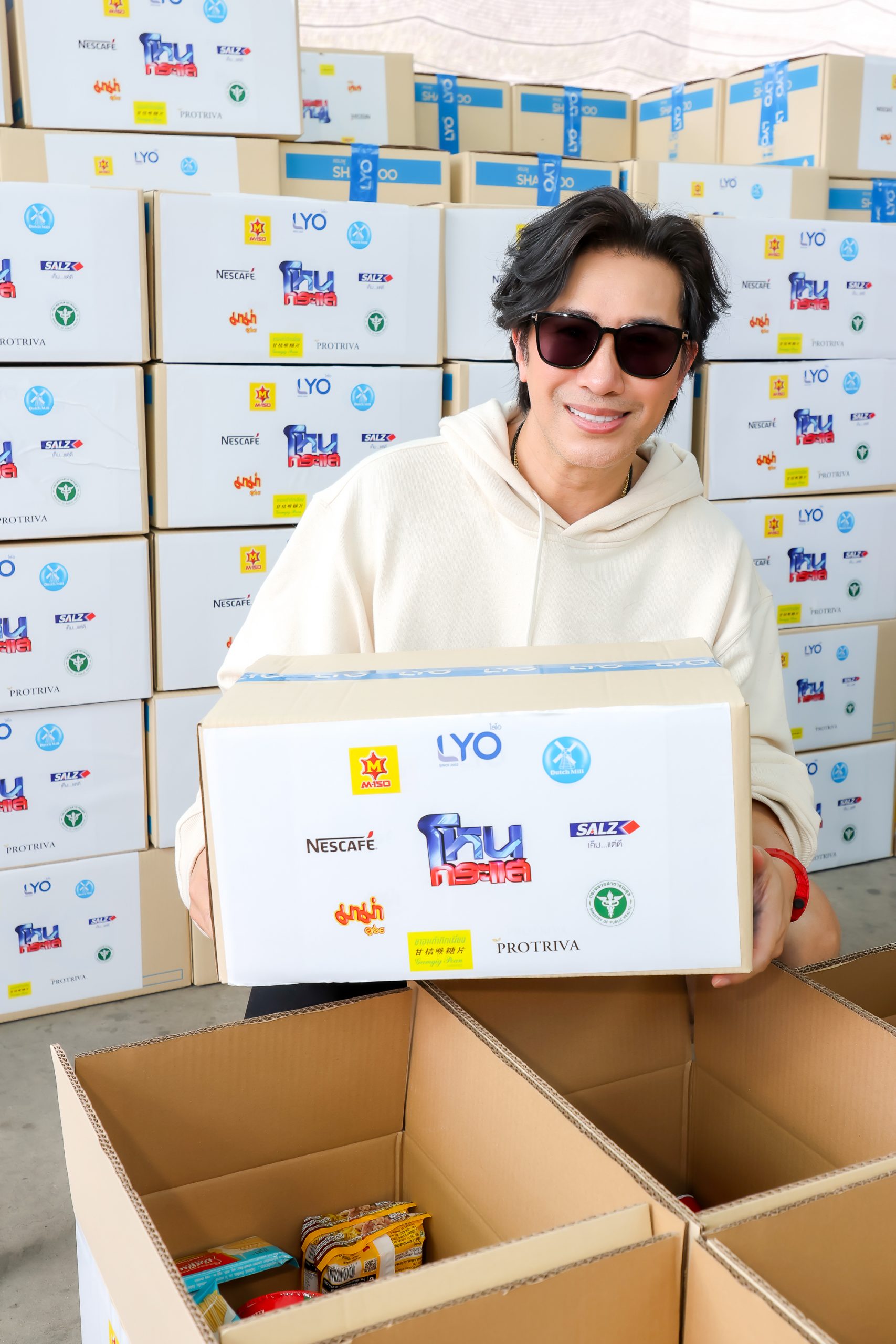 ล่าสุดมาแล้ว “หนุ่ม-กรรชัย กำเนิดพลอย” ผู้ประกาศข่าวรายการ “เที่ยงวันทันเหตุการณ์” ในฐานะที่เป็นเจ้าของ รายการ “โหนกระแส” และ ผลิตภัณฑ์ “ไลโอ (LYO)” พร้อมพันธมิตรอย่าง M150, ดัชมิลล์, เนสกาแฟ, ซอลส์, กระทรวงสาธารสุข, ยาอมกำกิกเผี่ยง, โปรทริว่า, มาม่า นำทีมพนักงาน บริษัท ดีคืนดีวัน จำกัด และ บริษัท 88(ไทยแลนด์) จำกัด จัดทำ “กล่องอิ่ม” จำนวน 1,000 กล่อง แจกจ่ายให้กับประชาชนที่เดือดร้อนในหลายชุมชน เพื่อเป็นส่วนหนึ่งในการบรรเทาทุกข์