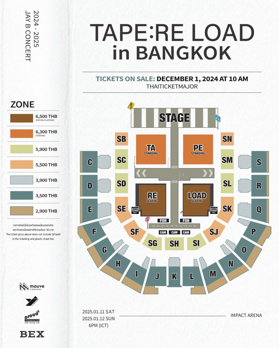 โดยงาน “2024-2025 JAY B CONCERT [TAPE: RE LOAD] IN BANGKOK” จะถูกจัดขึ้นในวันเสาร์ที่ 11 มกราคม 2568 และ วันอาทิตย์ที่ 12 มกราคม 2568 เวลา 18:00 น. ณ อิมแพ็ค อารีน่า เมืองทองธานี บัตรราคา 6,500 / 6,300 (บัตรยืน) / 5,900 / 5,500 / 3,900 / 3,500 และ 2,900 บาท โดยแต่ละราคาจะได้รับสิทธิพิเศษ ดังนี้