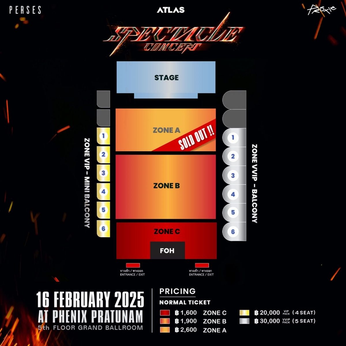 · ราคาบัตรโซน VIP ราคาแพคเหมารวม 1 ห้อง จำนวน 4 ที่นั่ง รวม 20,000 บาท (5,000 บาท/ที่นั่ง) พร้อม SET F&B มูลค่ารวม 2,400 บาท/ห้อง