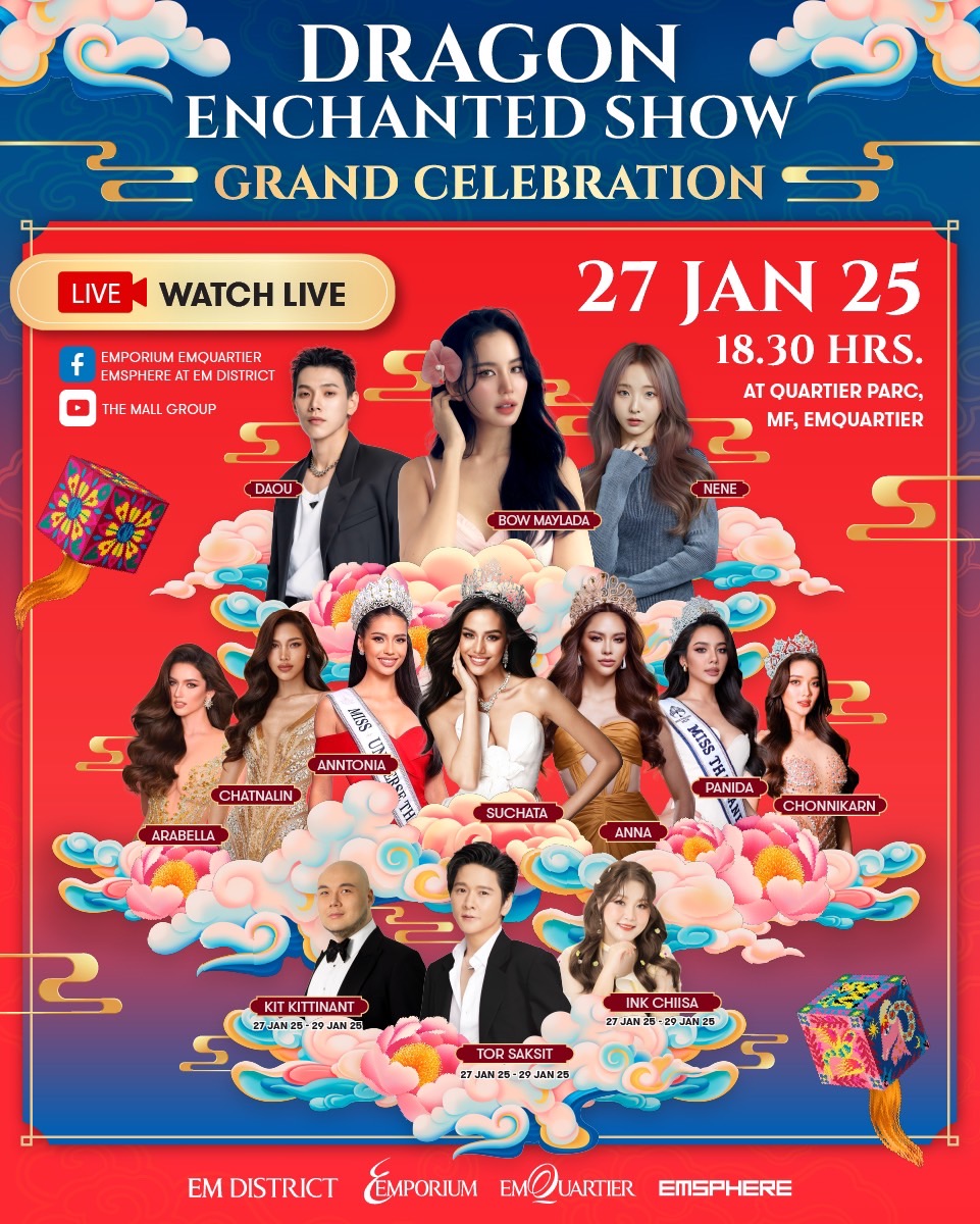 แฟนๆ เตรียมกรี๊ดรับต้นปีเมื่อ เอ็ม ดิสทริค (เอ็มโพเรียม, เอ็มควอทียร์, เอ็มสเฟียร์) ร่วมกับ สถานเอกอัครราชทูตสาธารณรัฐประชาชนจีนประจําประเทศไทย องค์กรภาครัฐและเอกชน ร่วมจัดงาน “EM DISTRICT THE GOLDEN YEAR OF FRIENDSHIP” ฉลองครบรอบ 50 ปี ความสัมพันธ์การทูตไทย-จีน และตรุษจีนปีมะเส็งมงคลชวน โบว์ เมลดา, ต้าห์อู๋ พิทยา, เนเน่ พรนับพัน, โต๋ ศักดิ์สิทธิ์ พร้อมด้วยศิลปินชื่อดังและเหล่าสาวงาม MISS UNIVERSE THAILAND มาร่วมโชว์ชุดพิเศษ “DRAGON HARMONIC ENCHANTED SHOW” ณ ควอเทียร์ พาร์ค ชั้น M ศูนย์การค้าเอ็มควอเทียร์ ในวันจันทร์ที่ 27 มกราคม 2568