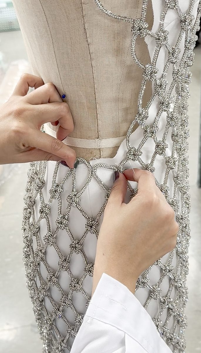 ความวิววับของคริสตัล เมื่อนำมาผสานกับศิลปะการถักเชือก มาคราเม่ (Macrame) สู่ เทคนิค ซิกเนเจอร์ของแบรนด์ อย่าง “คริสตัลมาคาเม่” หรือ การถักเชือกด้วยมือโดยไม่ใช้เข็มหรืออุปกรณ์ใดใด โดย ออม-ดิษยา เผยว่า เดรสชุดนี้สร้างสรรค์ขึ้นจากบุคลิกของสาวแต้วที่มีทั้งความน่ารัก ขี้เล่น ประกอบเป็นชุด After party จึงสอดแทรกความสนุกไว้ในซิลูเอตของชุด โดยนำ คริสตัลมาคาเม่ที่ถักทอเป็นลวดลายมาเย็บบนผ้าซาติน เชือกแต่ละเส้นประสานกันเป็นเดรสสั้น ดีไซน์หรู แต่งระบายที่ชายกระโปรง เพิ่มกิมมิกด้วยถุงมือปักคริสตัล และคฑาขนนกกระจอกเทศประดับคริสตัล เรียกว่าเป็นเดรสที่มีทั้งความอ่อนหวาน หรู และเซ็กซี่ ในเวลาเดียวกัน