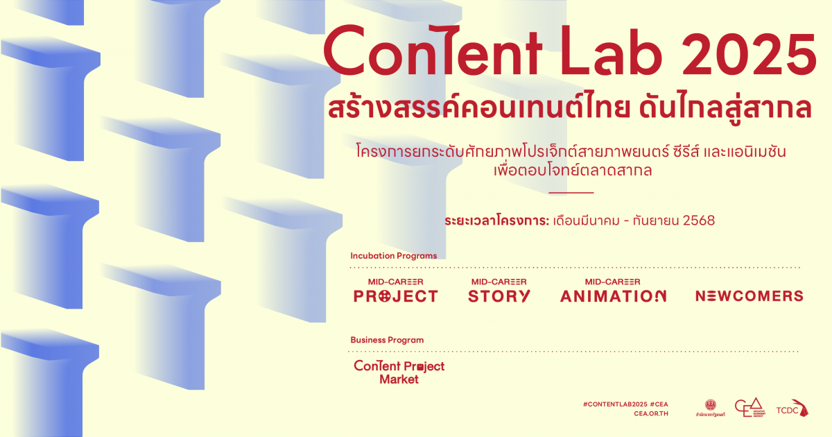 สามารถติดตามรายละเอียดเพิ่มเติมเกี่ยวกับโครงการ Content Lab 2025 ได้ที่ เฟซบุ๊กแฟนเพจ Content Lab รวมถึงกิจกรรมอื่น ๆ ของ CEA ได้ที่เว็บไซต์ www.cea.or.th