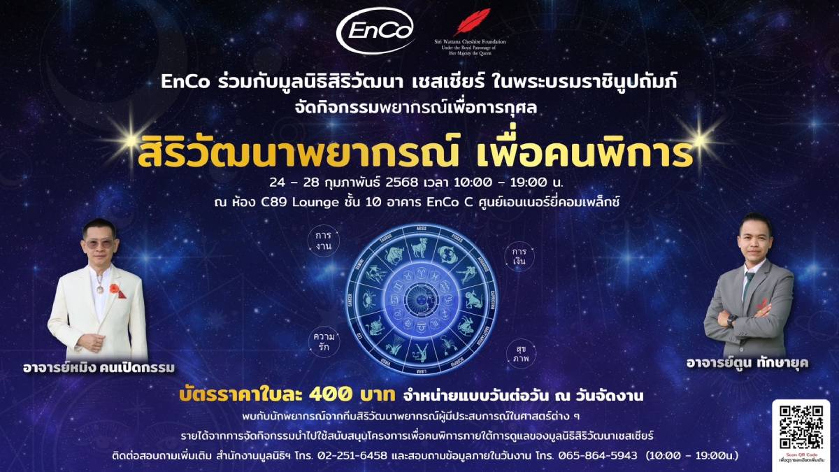 บริษัท เอนเนอร์ยี่ คอมเพล็กซ์ จำกัด หรือ EnCo ร่วมกับ มูลนิธิสิริวัฒนา เชสเชียร์ ในพระบรมราชินูปถัมภ์ ร่วมประชาสัมพันธ์กิจกรรม “สิริวัฒนาพยากรณ์ เพื่อคนพิการ” เชิญชวนผู้ชื่นชอบศาสตร์การพยากรณ์ไม่ว่าจะเป็น ไพ่ยิปซี โหราศาสตร์ ไพ่ทาโรต์ โหงวเฮ้ง และการดูลายมือ ร่วมงานดูดวงเพื่อการกุศลที่จัดขึ้นระหว่างวันที่ 24 – 28 กุมภาพันธ์ 2568 ณ ศูนย์เอนเนอร์ยี่คอมเพล็กซ์ โดยมีทีมนักพยากรณ์ชื่อดังมากประสบการณ์กว่า 20 ท่านจากหลากหลายศาสตร์ อาทิ อาจารย์หมิง คนเปิดกรรม อาจารย์ตูน ทักษายุค อาจารย์เจน ธูปพยากรณ์ เป็นต้น มาตรวจดวงชะตา วิเคราะห์ แนะนำปรับแผนการดำเนินชีวิตแบบเจาะลึกให้กับผู้ที่สนใจ