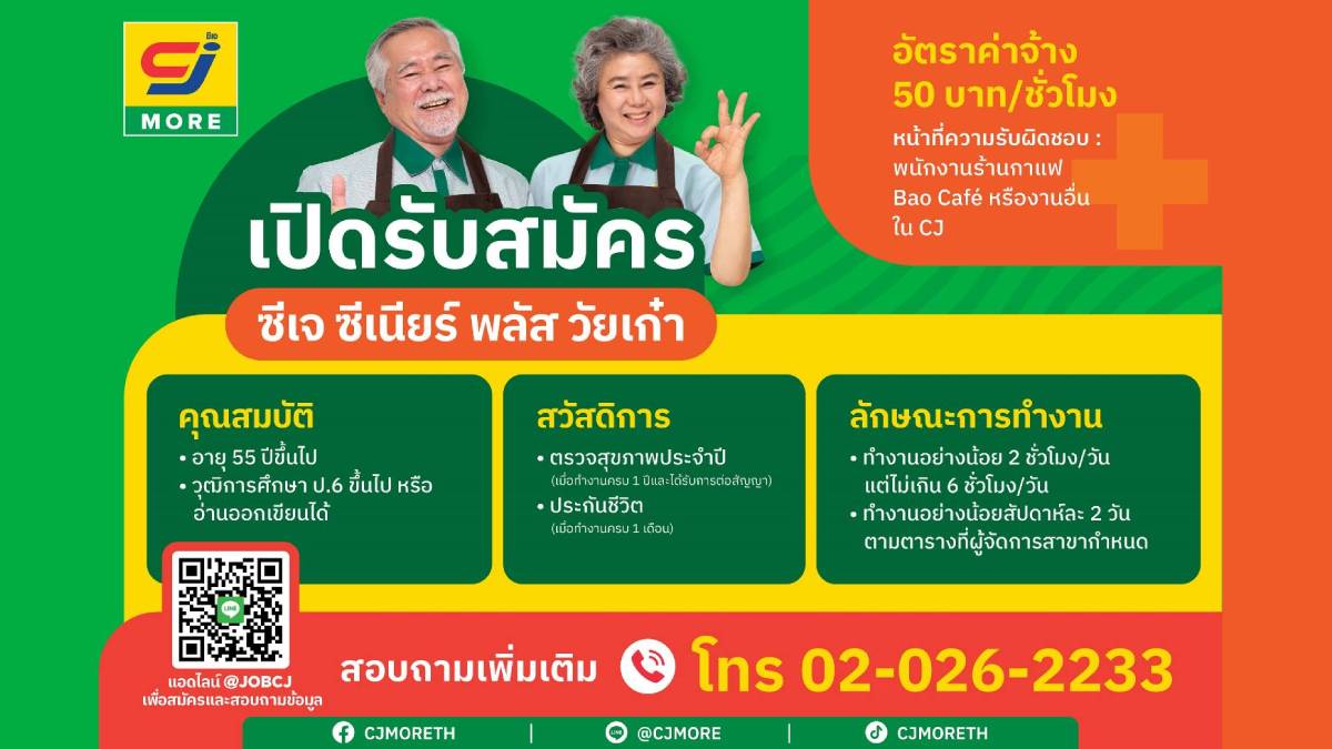 หากคุณเป็นวัยเก๋าไฟแรงที่อยากกลับมาทำงาน สร้างรายได้เสริม และใช้เวลาว่างให้เกิดประโยชน์ อย่ารอช้า! มาร่วมเป็นส่วนหนึ่งของ โครงการ “ซีเจ ซีเนียร์ พลัส วัยเก๋า” กับ ซีเจ มอร์ เพื่อเติมเต็มคุณค่าให้กับตัวเอง แอบกระซิบว่ารับไม่เกินสาขาละ 2 อัตราเท่านั้นนะ! สนใจสมัครหรือสอบถามข้อมูลเพิ่มเติม โทร 02-026-2233 หรือสามารถสแกนคิวอาร์โค้ดเพื่อแอดไลน์ @jobcj