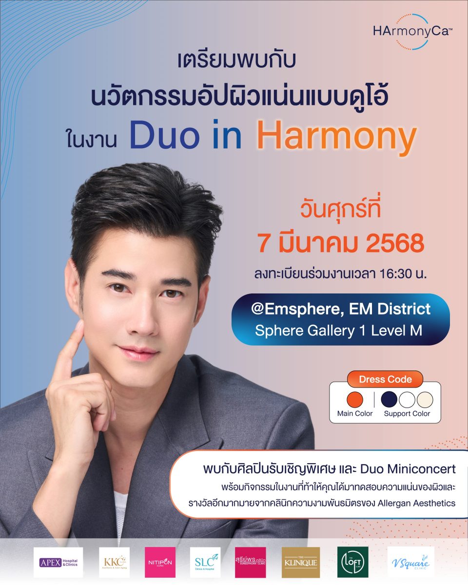 ไม่ไปจะพลาดมาก! เมื่อ “แอลเลอร์แกน เอสเธติกส์” (Allergan Aesthetics) ผู้นำเวชศาสตร์ความงามระดับโลกจากอเมริกา จัดงานใหญ่ “Duo in Harmony” ควงหนุ่มหล่อ มาริโอ้ เมาเร่อ มาเปิดตัวพรีเซนเตอร์ผลิตภัณฑ์ “ฮาร์โมนิกา” (HArmonyCa) นวัตกรรมดูโอ้อัปผิวแน่นในรูปแบบฉีด ผลิตภัณฑ์ที่จะมาช่วยตอบโจทย์คนที่มีปัญหาผิวหน้าไม่กระชับ หน้าหย่อนคล้อย หน้าหลวม ให้แลดูยกกระชับได้ตั้งแต่วันแรกหลังฉีด พร้อมเสริมการดูแลที่ชั้นคอลลาเจน มอบผิวเฟิร์มแน่นได้ยาวนานสูงสุดถึง 18 เดือน ในวันที่ 7 มีนาคม 2568 เวลา 18:00 น. ที่ Sphere Gallery ชั้น 1 ศูนย์การค้าเอ็มสเฟียร์