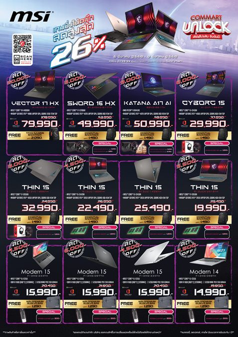 สุดพิเศษกับการเปิดปีกับ New Lineup MSI RTX 50 Series Laptop ที่ได้รับแรงบันดาลใจจากตำนานนอร์ส ที่เพิ่งเปิดตัวอย่างเป็นทางการไปเมื่อวันที่ 25 กุมภาพันธ์ 2568 ที่ผ่านมานี้โดยมีทั้งหมด5 ซีรีย์ด้วยกัน อาทิเช่น Titan Series, Raider Series, Stealth Series, Vector Series ที่มาจัดแสดงตัวเครื่องจริงให้เห็นก่อนใครภายในงาน Commart Unlock 2025นี้ ที่มาพร้อมกับประสิทธิภาพและศักยภาพการทำงานของทุกรุ่นที่หาตัวจับยาก ตอกย้ำด้วยดีไซน์ลวดลายที่รังสรรค์ออกมาอย่างไม่เหมือนใคร นำมาจัดแสดงให้ได้สัมผัสกับความเป็นที่สุดใน MSI Laptop พร้อมเปิดให้ Pre-Order และรับของที่ระลึกพิเศษไปทันทีในงานนี้มูลค่ารวมกว่า 12,630 บาท และOn top Exclusive Discount สูงสุดถึง 5,000 บาท!