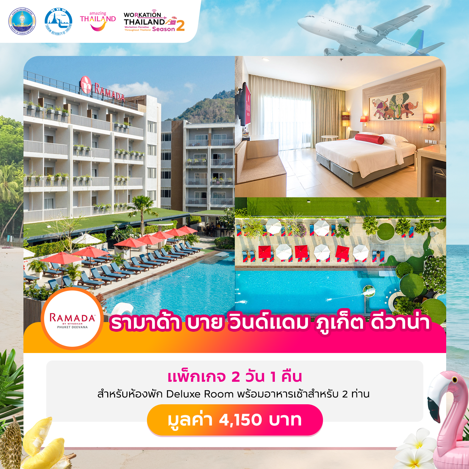 รอบสุดท้าย !! กับกิจกรรมส่งเสริมการขาย “100 เดียวเที่ยวได้งาน” ซึ่งเป็นกิจกรรมที่นำเสนอสินค้าและบริการด้านการท่องเที่ยวในราคาเพียง 100 บาท เพื่อส่งเสริมการตลาดและกระตุ้นให้เกิดการเดินทางท่องเที่ยวภายในประเทศในวันธรรมดา อีกทั้งยังเป็นการสร้างรายได้ให้กับผู้ประกอบการในอุตสาหกรรมท่องเที่ยว และในรอบสุดท้ายนี้จะเปิดให้นักท่องเที่ยวเข้าร่วมกิจกรรมได้ในวันที่ 20 มีนาคม 2568 และสามารถเลือกซื้อ Voucher ได้ตั้งแต่เวลา 10.00 น. เป็นต้นไป (หรือจนกว่าสินค้าจะหมด) First Come First Serve มาก่อน เลือกก่อน ได้ก่อน ผ่านเว็บไซต์ www.tourismthailand.org/workationthailand ซึ่งมีบัตรกำนัล (Voucher) สินค้าและบริการด้านการท่องเที่ยวที่นำเสนอขายมากมาย หลากหลายประเภท เช่น ประเภทโรงแรมที่พัก อาทิ การยา ท้องทราย เบย์ สมุย ครอส ริเวอร์แคว รีสอร์ท ศิลป์ บูทีค โฮเทล วาลา ชะอำ – นู แชปเตอร์ โฮเทล อลีนตา หัวหิน – ปราณบุรี แชปเตอร์ โฮเทล ป่าทำมา ไฮด์อเวย์ รีสอร์ท เซนศาลา ริเวอร์พาร์ค รีสอร์ท พลูแมนเขาหลัก รีสอร์ท และคาทิลิยาเมาท์เทนรีสอร์ทแอนด์สปา ประเภทกิจกรรมท่องเที่ยวและแพ็กเกจท่องเที่ยว อาทิ วานา นาวา วอเตอร์ จังเกิ้ล พิพิธภัณฑ์ ริบลีส์ เชื่อหรือไม่ และโอเอซิสสปา เป็นต้น ทั้งนี้ยังมี บัตรกำนัล (Voucher) สินค้าและบริการด้านการท่องเที่ยวจากสถานประกอบการชั้นนำที่เข้าร่วมกิจกรรมอีกมากมายให้นักท่องเที่ยวได้เลือกซื้อ