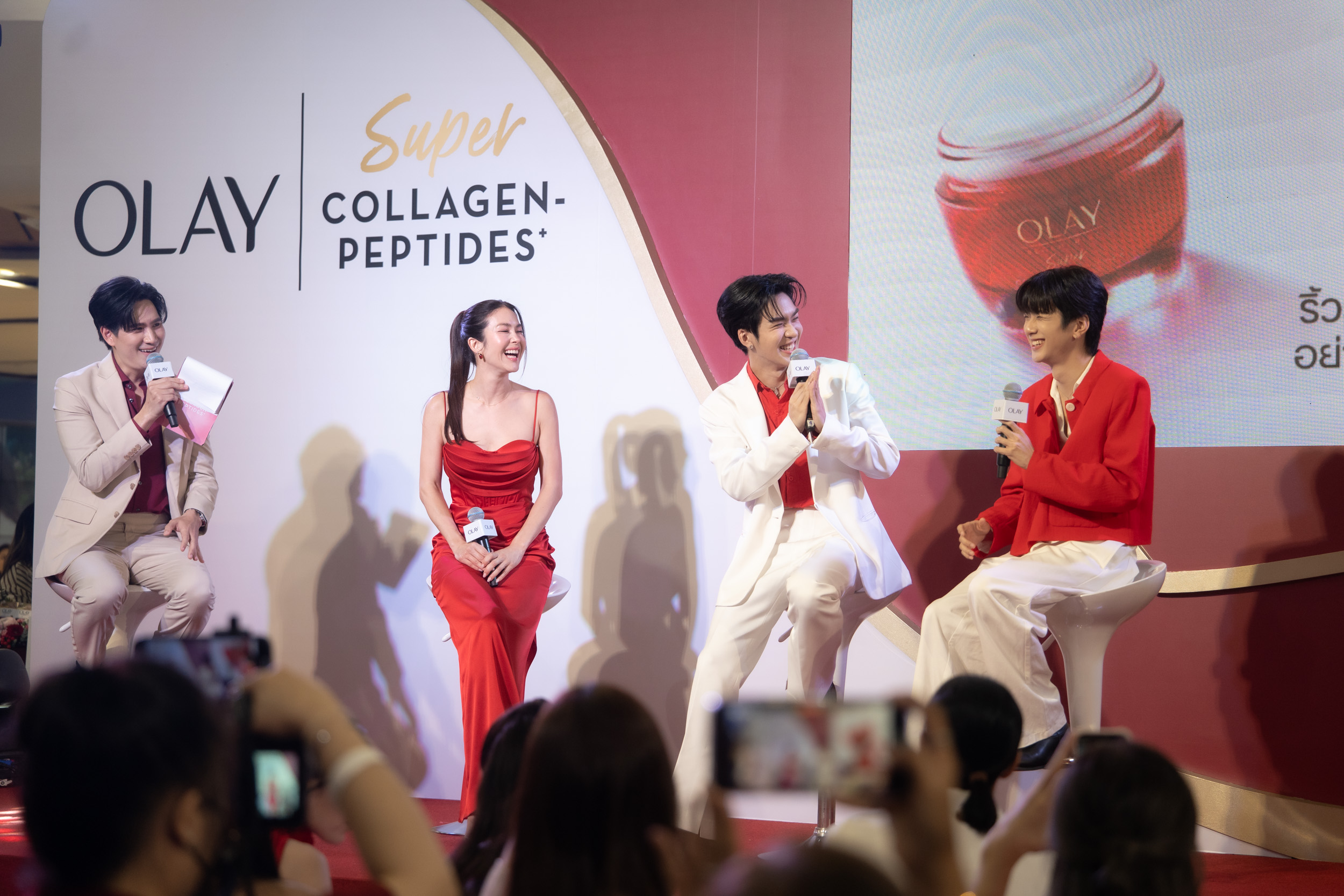 คุณเวธนี อัศววริยชน Olay Brand Director กล่าวถึงการจัดงานครั้งนี้ว่า “Olay เรามุ่งมั่นสนับสนุนให้ทุกคนมีผิวสุขภาพดีและมั่นใจในแบบของตัวเอง งานวันนี้เราจึงได้เปิดตัวผลิตภัณฑ์ใหม่ ที่เราใช้เวลาคิดค้นส่วนผสมหลักมากว่า 50 ปีเพื่อให้ได้เป็นส่วนผสมที่ดีที่สุด “คอลลาเจน 5 ชนิด” ก่อนจะออกมาเป็น Olay Super Collagen-Peptides Moisturiser ครีมบำรุงผิวหน้าที่จะช่วยลดเลือน 5 ริ้วรอยแห่งวัยค่ะ ทั้งริ้วรอยลึก ตีนกา ร่องแก้ม ผิวไม่เรียบเนียน และความหย่อนคล้อย หลังใช้อย่างต่อเนื่อง 28 วัน เราพบว่าผู้ใช้ 97% รู้สึกผิวดูเด้งกระชับ มีความเรียบเนียนขึ้น และผู้ใช้ทุกคนเห็นว่าริ้วรอยดูลดเลือนค่ะ ซึ่งอยากให้ทุกคนได้ลองใช้และผลิตภัณฑ์ชิ้นนี้ผ่านการทดสอบโดยแพทย์ผิวหนัง สามารถใช้ได้กับทุกสภาพผิวแม้ผิวแพ้ง่าย และในวันนี้เราได้รับเกียรติจากคุณพอลล่า เทเลอร์ ร่วมเป็นพรีเซนเตอร์พาทุกคนพิสูจน์ถึงประสิทธิภาพผลิตภัณฑ์ ทั้งยังมี 2 หนุ่มคู่จิ้นชื่อดัง คุณอู่อู๋ – ธนภูมิ และ คุณเซฟ วรพงษ์ มาร่วมสร้างโมเมนต์สุดพิเศษให้กับแฟนโอเลย์ของเราในวันนี้ด้วยค่ะ”