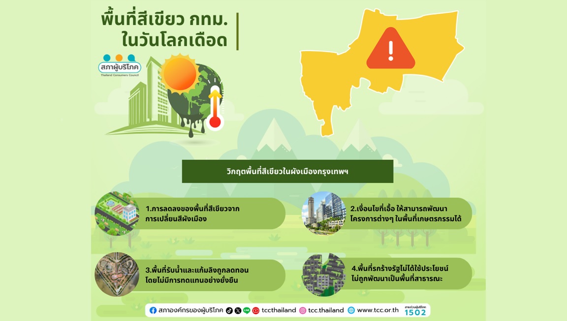 เนื่องในวันลดโลกร้อนวันที่ 22 เมษายน ของทุกปี สภาองค์กรของผู้บริโภคแสดงความห่วงใยต่อสถานการณ์การจัดการพื้นที่สีเขียวในกรุงเทพมหานคร โดยชี้ว่า ปัญหาการลดลงของพื้นที่สีเขียวในผังเมืองไม่เพียงส่งผลกระทบต่อระบบนิเวศและคุณภาพชีวิตของประชาชนเท่านั้น แต่ยังสะท้อนถึงช่องโหว่ของระบบการวางแผนเมือง และการบังคับใช้กฎหมายผังเมืองที่ไม่เข้มแข็งพอ