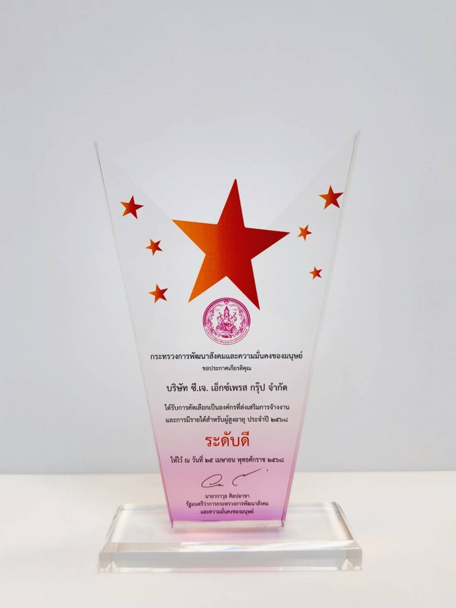 และล่าสุด นายธเนศพล ธนบุณยวัฒน์ ผู้ช่วยรัฐมนตรีระจำกระทรวงการพัฒนาสังคมและความมั่นคงของมนุษย์ (พม.) เป็นผู้แทนมอบโล่ประกาศเกียรติคุณ “รางวัลองค์กรที่ส่งเสริมการจ้างงานและการมีรายได้สำหรับผู้สูงอายุ ประจำปี 2568” ในระดับดี จากกรมกิจการผู้สูงอายุ ให้กับ บริษัท ซี.เจ.เอ็กซ์เพรส กรุ๊ป จำกัด โดยมี ดร. ปาริชาต มั่นสกุล กรรมการเพื่อการพัฒนาอย่างยั่งยืน เป็นผู้รับมอบ ภายในงาน Senior Job Connect : งานดี ชีวิตดี ไม่มีเกษียณ ณ ศูนย์นิทรรศการและการประชุมไบเทค (BITEC) กรุงเทพฯ เมื่อเร็ว ๆ นี้