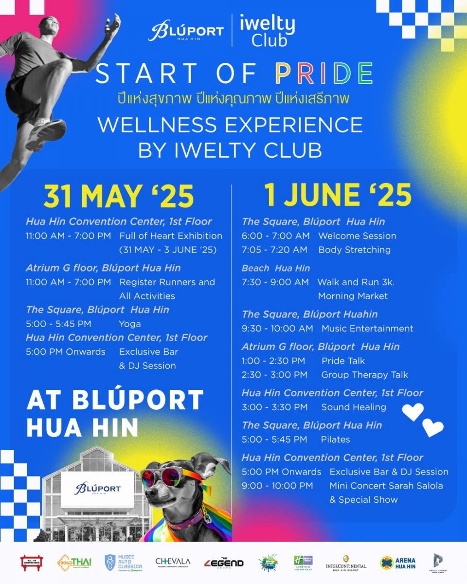 บลูพอร์ต หัวหิน และ กลุ่มบริษัทพราว ร่วมกับ iwelty club เริ่มต้นเดือนแห่งความภาคภูมิใจด้วยการเชิญชวนทุกหัวใจร่วมเฉลิมฉลองความหลากหลายทางเพศและความเท่าเทียม ในงาน Bluport Hua Hin: Start of Pride “Come as you are, leave with a healed heart.” (มาด้วยหัวใจแบบไหน… กลับไปด้วยหัวใจที่เบาขึ้น) ระหว่างวันที่ 31 พฤษภาคม – 3 มิถุนายน 2568 ภายใต้แนวคิด “Pride Active & Wellness” ถือเป็นครั้งแรกของประเทศไทยกับแนวคิดใหม่ที่ผสานพลังของสุขภาพกายและใจเข้ากับการเฉลิมฉลองความหลากหลายและความรักอย่างเท่าเทียม ผ่านกิจกรรมที่เต็มไปด้วยพลังบวก สีสัน และการเคลื่อนไหว ซึ่งไม่ได้เป็นเพียงแค่สนับสนุนด้านสุขภาพ คุณภาพชีวิต เสรีภาพ แต่เป็นการส่งเสริมการอิสรภาพที่แท้จริงจากภายใน พบกับไฮไลท์พิเศษ “Hua Hin Pride Walk & Run” ในวันที่ 1 มิถุนายน 2568 กิจกรรมเดิน-วิ่ง ที่จะพาทุกคนสนุกไปกับสีสันแห่งเสรีภาพท่ามกลางบรรยากาศอบอุ่นริมหาดหัวหิน พร้อมด้วยเหล่าคนดัง อาทิ ปิงปอง-ธงชัย, ติ๊นา ศุภนาฏ, ป้อปปี้-ชัชชญา, ไบรอัน ตัน และอีกมากมาย ที่จะมาร่วมแสดงพลังแห่งความรัก ความเท่าเทียม พร้อมสร้างพลังบวกให้กับร่างกายและจิตใจไปด้วยกัน