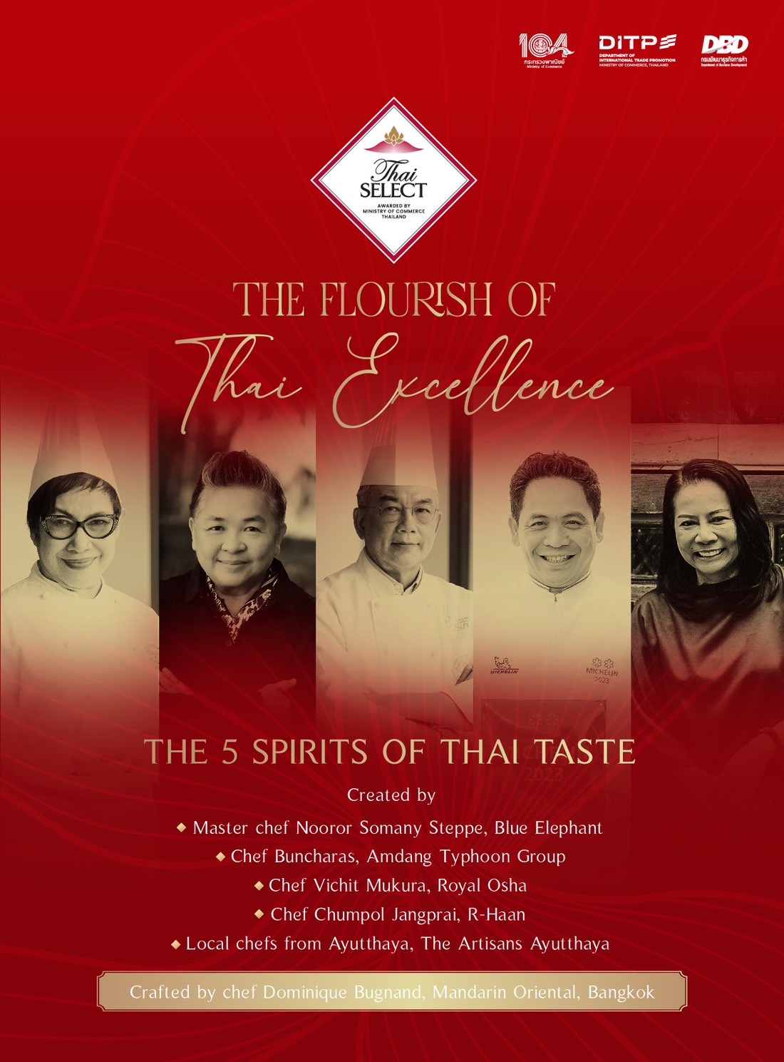 ภายในงาน Thai SELECT Royal Gala Night ผู้เข้าร่วมจะได้สัมผัสความพิเศษของ ห้าจิตวิญญาณแห่งรสชาติไทย ภายใต้แนวคิด “THE 5 SPIRITS OF THAI TASTE” สะท้อนรสชาติหลักของอาหารไทย ได้แก่ เปรี้ยว หวาน มัน เค็ม และเผ็ด ซึ่งแต่ละเมนูถูกรังสรรค์อย่างพิถีพิถันเพื่อเชิดชูแก่นแท้แห่งรสชาติอาหารไทย โดย สุดยอดเชฟจาก 5 ร้านอาหารชื่อดังในโครงการ Thai SELECT เพื่อส่งมอบประสบการณ์การลิ้มรสอาหารไทยที่น่าประทับใจ สะท้อนเสน่ห์แห่งวัฒนธรรมไทยให้ตราตรึงใจมิรู้ลืม โดยคอร์สอาหารทั้ง 5 ได้แก่ 1) The Awakening Spirit (รสเปรี้ยว) โดย BLUE ELEPHANT 2) The Grounded Spirit (รสเค็ม) โดย Amdang Typhoon Group 3) The Fiery Spirit (รสเผ็ด) โดย Royal Osha 4) The Soulful Spirit (รสมัน) โดย R-HAAN และ 5) The Nostalgic Spirit (รสหวาน) โดย The Artisans Ayutthaya
