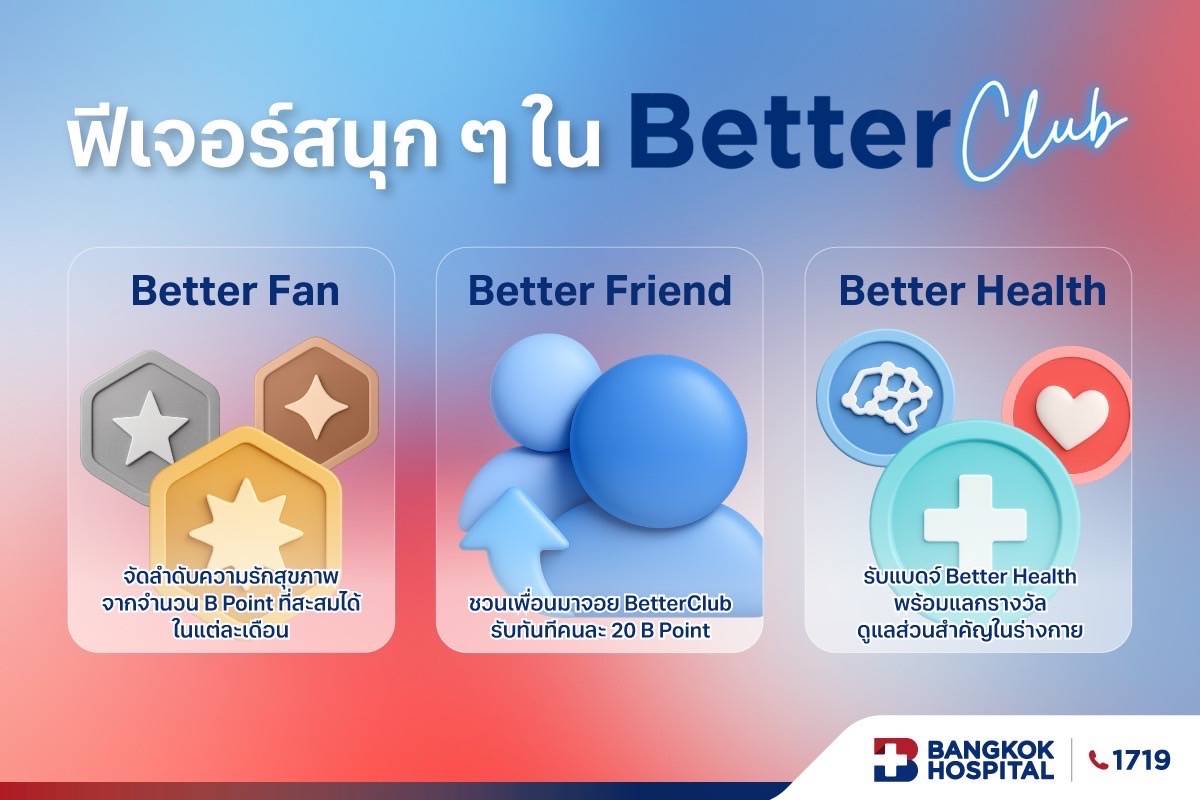 กรุงเทพฯ พฤษภาคม; โรงพยาบาลกรุงเทพ อยากเห็นคนไทยมี ‘สุขภาพดีขึ้น’ จากการเปิดมุมมองเรื่องโรคและการรักษาที่หลากหลาย จึงเปิดตัว Better Club ชวนคนทุก GEN ร่วมสนุกกับการเก็บ B Point ได้ทุกวันผ่านทางเว็บไซต์ของโรงพยาบาลกรุงเทพ bangkokhospital.com เพื่อนำไปแลกของรางวัลด้านสุขภาพได้โดยไม่ต้องลุ้น