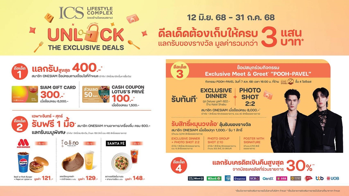 ICS Lifestyle Complex ตรงข้ามไอคอนสยาม จัดโปรปังกลางปี “ICS UNLOCK THE EXCLUSIVE DEALS” ดีลเด็ดที่มาพร้อมของรางวัลมูลค่ารวมกว่า 3 แสนบาท ให้ลูกค้าไอซีเอสช็อปสนุก ได้ครบทุกความสุข ทั้งการเก็บคูปองเงินสด แลก SIAM GIFT CARD อร่อยฟรีกับร้านอาหารชื่อดัง และพิเศษสุดกับการลุ้นร่วมกิจกรรม “EXCLUSIVE DINNER WITH POOH-PAVEL” คู่จิ้นสุดฮอตจาก “Pit Babe The Series” สายช็อป สายกิน และสายฟิน อย่าพลาด ช็อปเก็บดีลเด็ดตั้งแต่วันที่ 12 มิถุนายน 2568- 31 กรกฎาคม 2568 ที่ ICS Lifestyle Complex
