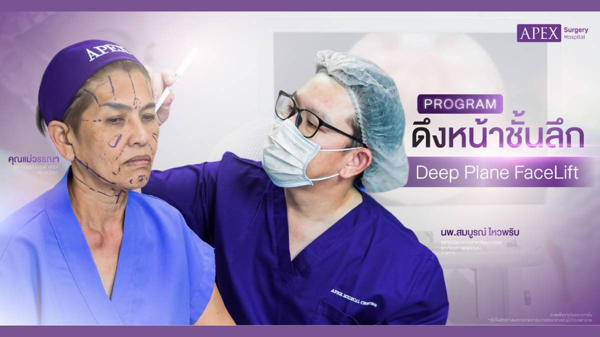 ที่ Apex Medical Center มีโปรแกรมดึงหน้าและดึงคอ (Full Facelift & Neck Lift) ด้วยเทคนิคต่าง ๆ รวมถึง Deep Plane Facelift Program จากคุณหมอสมบูรณ์ ไหวพริบ ว.22713 ในราคา 380,000 บาท เพื่อคืนความอ่อนเยาว์ให้ใบหน้าและลำคออย่างเป็นธรรมชาติขึ้นและเหมาะสมกับแต่ละบุคคล