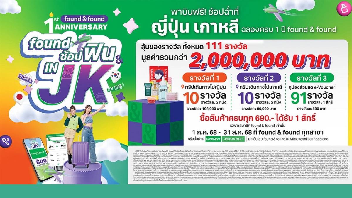 “found & found” บิวตี้เดสติเนชันสินค้าความงามจากญี่ปุ่น–เกาหลี ส่งแคมเปญพิเศษฉลองครบรอบ 1 ปี ชวนนักช้อปร่วมลุ้น บินลัดฟ้าฟรี ช้อปฉ่ำที่ ญี่ปุ่น เกาหลี กับเที่ยวบิน “found ช้อปฟิน IN JK” และลุ้นรับของรางวัลอื่นๆ อีกมากมาย เพียงซื้อสินค้าที่ร่วมรายการในร้าน found & found ครบทุก 690 บาท จะได้ลุ้น 1 สิทธิ์ ยิ่งซื้อเยอะ ยิ่งมีสิทธิ์เยอะ ร่วมเป็นหนึ่งในผู้โชคดีลุ้นรับของรางวัลกว่า 111 รางวัล รวมมูลค่ากว่า 2,000,000 บาท สามารถร่วมสนุกลุ้นรับโชคกับแคมเปญนี้ได้ ตั้งแต่วันที่ 1 ก.ค.-31 ส.ค. 2568 นี้เท่านั้น