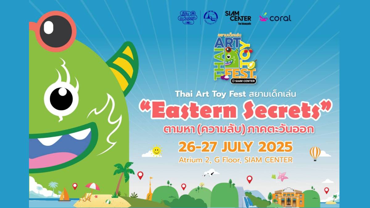 เทศกาลอาร์ตทอยโดยศิลปินไทยที่จะชวนแพ็คกระเป๋าออกไปท่องเที่ยวเมืองไทยกลับมาอีกครั้งใน Thai Art Toy Fest : สยามเด็กเล่น @Siam Center ตอน “Eastern Secrets : ตามหา (ความลับ) ภาคตะวันออก” โดย การท่องเที่ยวแห่งประเทศไทย ภูมิภาคภาคตะวันออก ร่วมกับ Siam Center และ Coral โดย บริษัท กสิกร เอกซ์ จำกัด ชวนเปิดประสบการณ์เที่ยวภาคตะวันออกผ่านอาร์ตทอยไปพร้อมๆ กัน พร้อมแล้วที่จะยกสีสันภาคตะวันออก และเรื่องเล่าประเทศไทยในหลากหลายแง่มุม ครบทั้งศิลปวัฒนธรรม ประเพณี อาหารถิ่น ประวัติศาสตร์ แลนด์มาร์ก ไปจนถึงเรื่องเล่าตำนานและความเชื่อ ถ่ายทอดผ่านของสะสมและงานศิลปะ “อาร์ตทอย” ไฮไลต์คือการรวมตัวของศิลปินไทยและสตูดิโออาร์ตทอยไทยกว่า 30 ศิลปิน / สตูดิโอ ในวันที่ 26-27 กรกฎาคม 2568 ณ Atrium 2 ชั้น G Siam Center ตั้งแต่เวลา 10.00 น. เป็นต้นไป