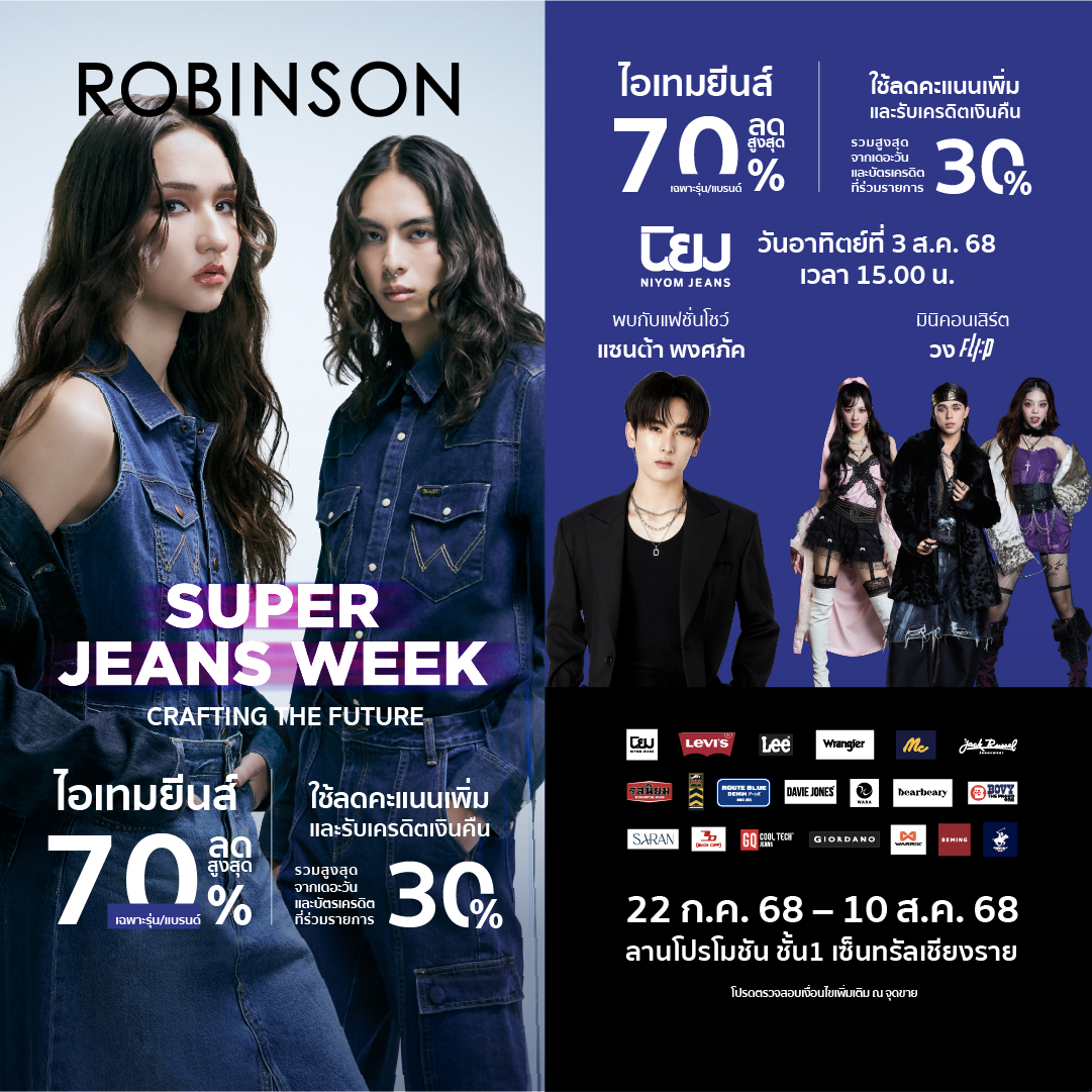 ห้างโรบินสัน เชียงราย ในเครือเซ็นทรัล รีเทล ตอกย้ำความเป็นยีนส์เดสติเนชันอันดับหนึ่งของไทย กับแคมเปญยีนส์สุดยิ่งใหญ่แห่งปี “Robinson Super Jeans Week On Tour” ณ ลานโปรโมชัน ชั้น 1 เซ็นทรัล เชียงราย ตั้งแต่วันที่ 22 ก.ค. 2568 – 10 ส.ค. 2568