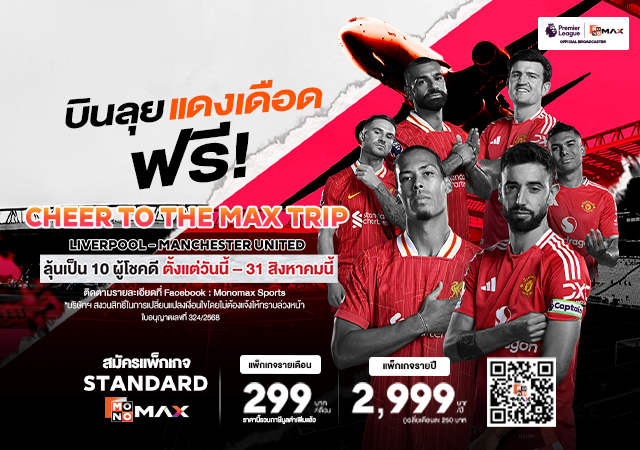 MONOMAX ออกกิจกรรมเอาใจแฟนบอลขั้นสุดกับ CHEER TO THE MAX VOL.1 ที่พาผู้โชคดีลุ้นบินไกลถึงอังกฤษ เชียร์ติดขอบสนามแอนฟิลด์ในศึกแดงเดือด ลิเวอร์พูล พบ แมนเชสเตอร์ ยูไนเต็ด ในวันที่ 18 ต.ค. 2568 นี้ โดยผู้โชคดีทั้ง 10 ท่านจะได้เดินทางไปเยือนประเทศอังกฤษระหว่างวันที่ 16-21 ต.ค. 2568 แบบฟรีๆ! เที่ยวแบบจัดเต็ม ถูกใจคอบอลทั้งแฟนหงส์และแฟนผี กับการพาทัวร์สนามแอนด์ฟิลด์และสนามโอลด์แทรฟฟอร์ด พร้อมด้วยแมทช์แดงเดือดแบบใกล้มากกว่าที่คุณเคยสัมผัส