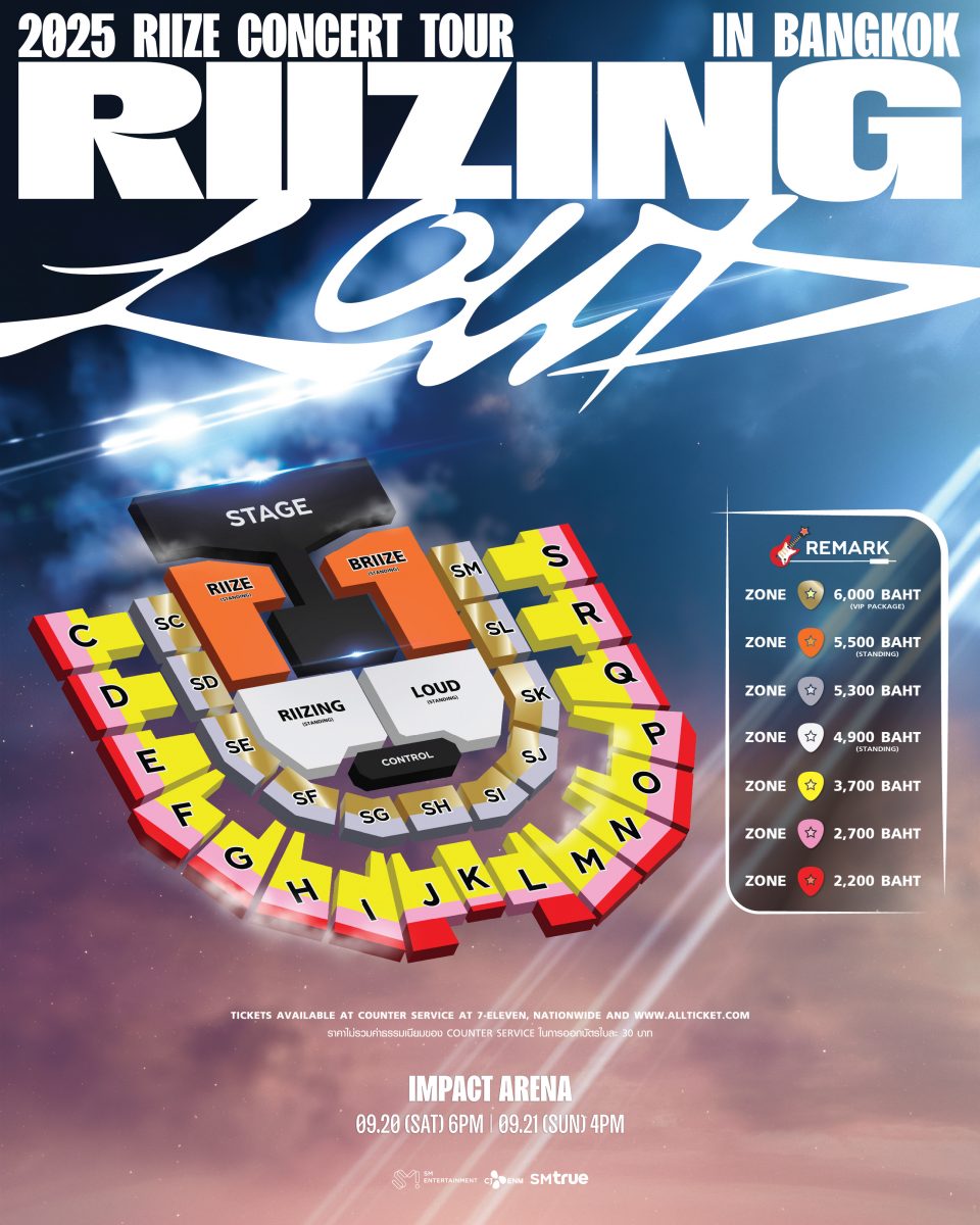 SM True (เอสเอ็ม ทรู) ปลุกพลังแห่งเสียงดนตรีให้ดังกึกก้องทั่วอิมแพ็ค สู่เส้นทางการเติบโตอย่างไม่หยุดยั้งของ RIIZE (ไรซ์) กับคอนเสิร์ตเดี่ยวเต็มรูปแบบครั้งแรกในประเทศไทย 2025 RIIZE CONCERT TOUR [RIIZING LOUD] IN BANGKOK (ทูเธาซันด์ทเวนตี้ไฟว์ ไรซ์ คอนเสิร์ต ทัวร์ [ไรซิ่ง ลาวด์] อิน แบงค็อก) ในวันเสาร์ที่ 20 กันยายน 2025 เวลา 18:00 น. และวันอาทิตย์ที่ 21 กันยายน 2025 เวลา 16:00 น. ณ อิมแพ็ค อารีน่า