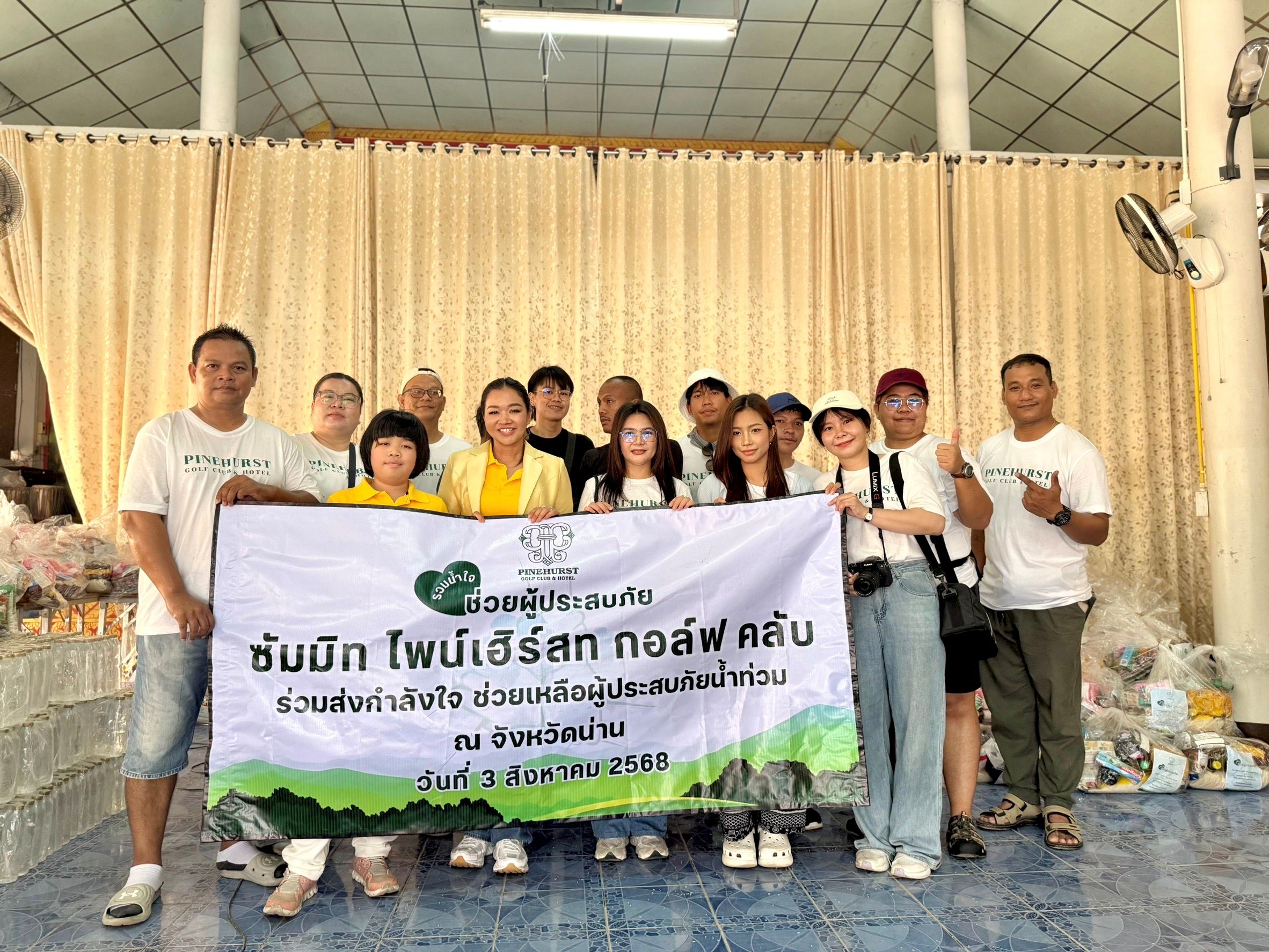 สนามกอล์ฟไพน์เฮิร์สท (Pinehurst Golf & Country Club) นำโดย คุณกรณ์ภัสสร จึงรุ่งเรืองกิจ รองประธานที่ปรึกษา ไพน์เฮิร์สท กรุ๊ป พร้อมด้วยเหล่าพนักงาน ร่วมแรงร่วมใจจัดทำ ถุงยังชีพจำนวนถึง 400 ชุด พร้อมด้วยน้ำดื่ม เพื่อลุยเดินทางไปช่วยเหลือผู้ประสบอุทกภัยในพื้นที่จังหวัดน่าน ซึ่งได้รับผลกระทบอย่างรุนแรงหนักจากสถานการณ์น้ำท่วมในช่วงที่ผ่านมา