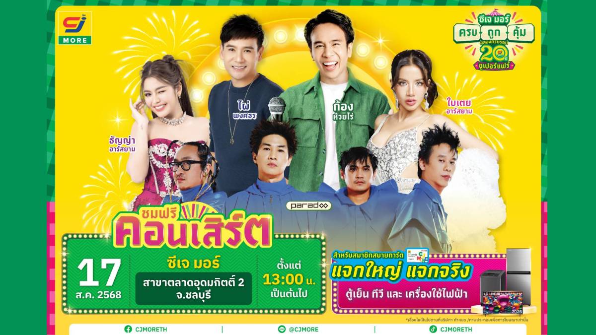 วอร์มเสียงกรี๊ดให้พร้อม! ซีเจ มอร์ (CJ MORE) เตรียมปลุกชลบุรีให้คึกคักยิ่งกว่าเดิม กับงาน “ซีเจ มอร์ ครบ ถูก คุ้ม ฉลอง 20 ปี ซูเปอร์แฟร์” ที่ขนทัพศิลปินเบอร์ใหญ่ระดับประเทศมาปรากฏตัวตรงหน้าคุณแบบตัวจริงเสียงจริงเรียกได้ว่า คิวทองชนคิวทอง เพราะความสนุกจะอัดแน่นตลอดทั้งวัน นำโดย ก้อง-ห้วยไร่ และ ไผ่-พงศธร สองศิลปินคุณภาพ ที่จะมาเสิร์พความมันส์พร้อมอารมณ์ซึ้งให้สุดหัวใจ ตามด้วย ธัญญ่า และ ใบเตย อาร์สยาม สองสาวพลังแซ่บ ที่แค่ก้าวขึ้นเวทีก็สะกดทุกสายตา และปิดท้ายด้วย พาราด็อกซ์ ที่จะมาเติมสีสันให้เวทีร้อนแรงยิ่งขึ้น ครบทุกแนว ครบทุกอารมณ์ จะเต้น จะโยก จะอิน จะมันส์ ก็มีให้หมดในวันเดียว งานนี้เข้าฟรี!