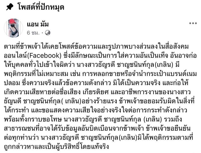ตามที่ตลอดระยะเวลากว่า 1 ปีที่ผ่านมา นางสาวธัญรดี ชาญชนินท์กุล หรือ เกลิน ธัญรดี นักแสดง ได้ถูกใส่ร้ายและเผยแพร่ข้อความอันเป็นเท็จในสื่อสังคมออนไลน์ จนส่งผลกระทบต่อชื่อเสียง เกียรติยศ และภาพลักษณ์ทางอาชีพ