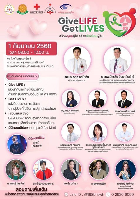 โรงพยาบาลธรรมศาสตร์เฉลิมพระเกียรติ ร่วมกับ ศูนย์รับบริจาคอวัยวะและศูนย์ดวงตา สภากาชาดไทย เตรียมจัดงาน “Give LIFE Get LIVES: สร้างกุศลผู้ให้ สร้างชีวิตใหม่ผู้รับ” เนื่องใน World Transplant Month 2025 เพื่อรณรงค์และสร้างความเข้าใจที่ถูกต้องเกี่ยวกับการบริจาคและการปลูกถ่ายอวัยวะ