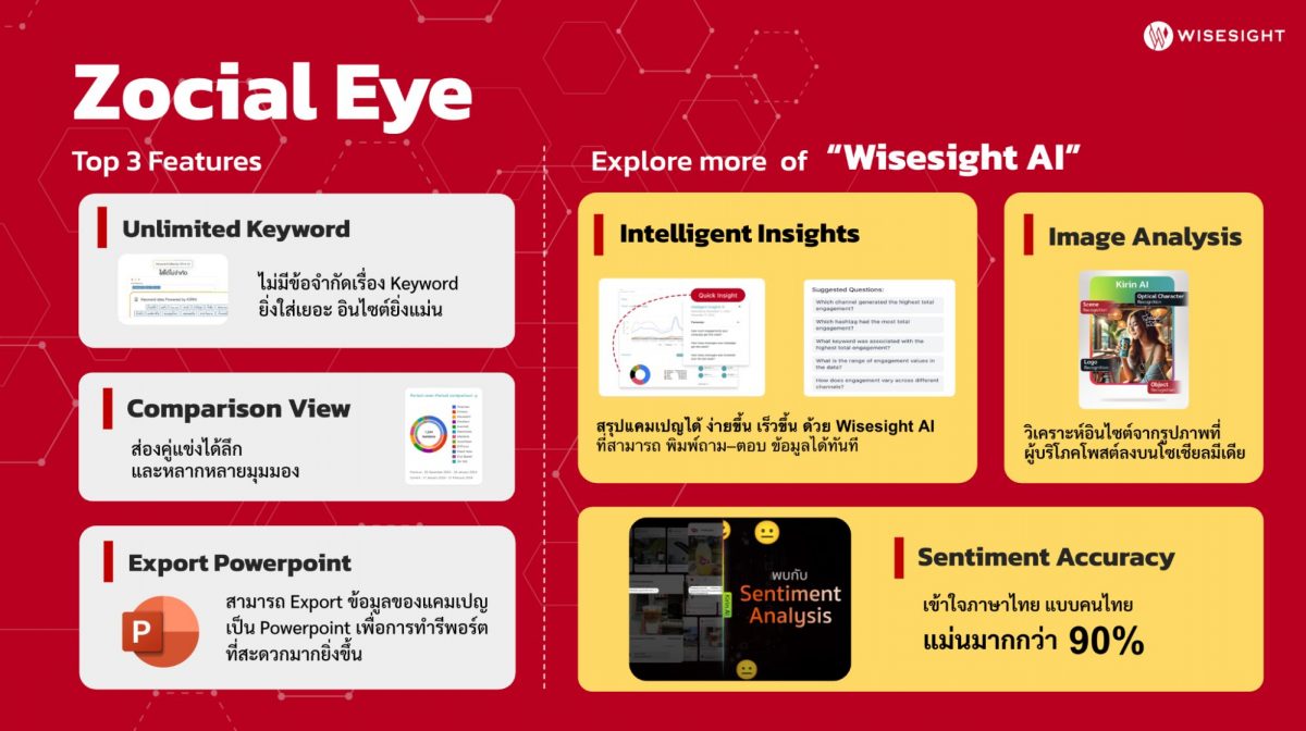 สำหรับธุรกิจที่ต้องการต่อยอดกลยุทธ์การตลาดออนไลน์ให้แม่นยำและขับเคลื่อนด้วยข้อมูลเชิงลึก Wisesight ในฐานะผู้นำด้านการวิเคราะห์ข้อมูลบนโซเชียลมีเดียคือพันธมิตรที่น่าเชื่อถือด้วยการใช้เครื่องมือ Zocial Eye ที่ช่วยรวบรวมและวิเคราะห์พฤติกรรมผู้บริโภคบนโซเชียลมีเดียแบบรอบด้าน ทำให้ธุรกิจเข้าใจ Insight ของลูกค้าบนโลกออนไลน์อย่างละเอียด สามารถนำไปใช้ในการวางแผนกลยุทธ์การตลาดได้อย่างเหมาะสมและมีประสิทธิภาพ เพื่อขับเคลื่อนธุรกิจให้เดินหน้าบนโลกออนไลน์อย่างมั่นคงและประสบความสำเร็จตามที่ตั้งเป้าไว้