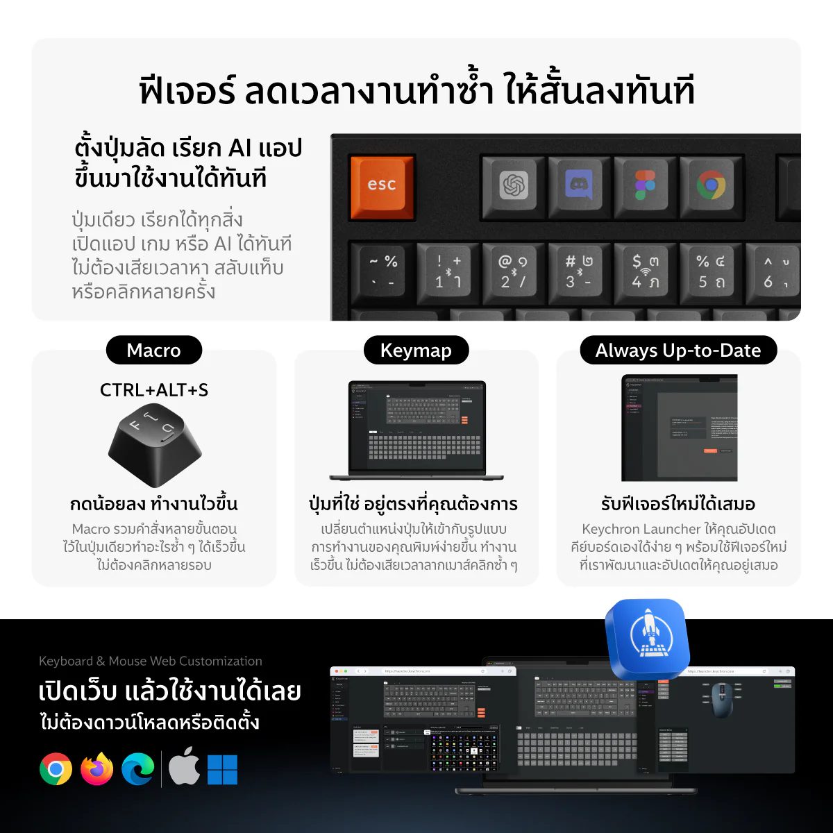 • ใช้งานกับ Keychron Launcher อัปเดตซอฟต์แวร์พร้อมฟีเจอร์ใหม่ได้เสมอ ผ่าน Web Browser ตั้งค่าและปรับแต่งปุ่ม โปรไฟล์ และคีย์ลัดได้อิสระ มาพร้อมฟังก์ชันขั้นสูง รวมงานซ้ำ ๆ ไว้ปุ่มเดียวด้วย Macro และ Quick Action ที่กดเพียงปุ่มเดียวก็สามารถเปิดโปรแกรมหรือเว็บไซต์ที่ใช้บ่อยได้รวดเร็ว ปรับหน้าที่และตำแหน่งปุ่มด้วย Keymap อีกทั้งยังมี Memory ในตัว ทำให้ย้ายไปใช้งานกับเครื่องอื่นได้โดยไม่ต้องตั้งค่าใหม่